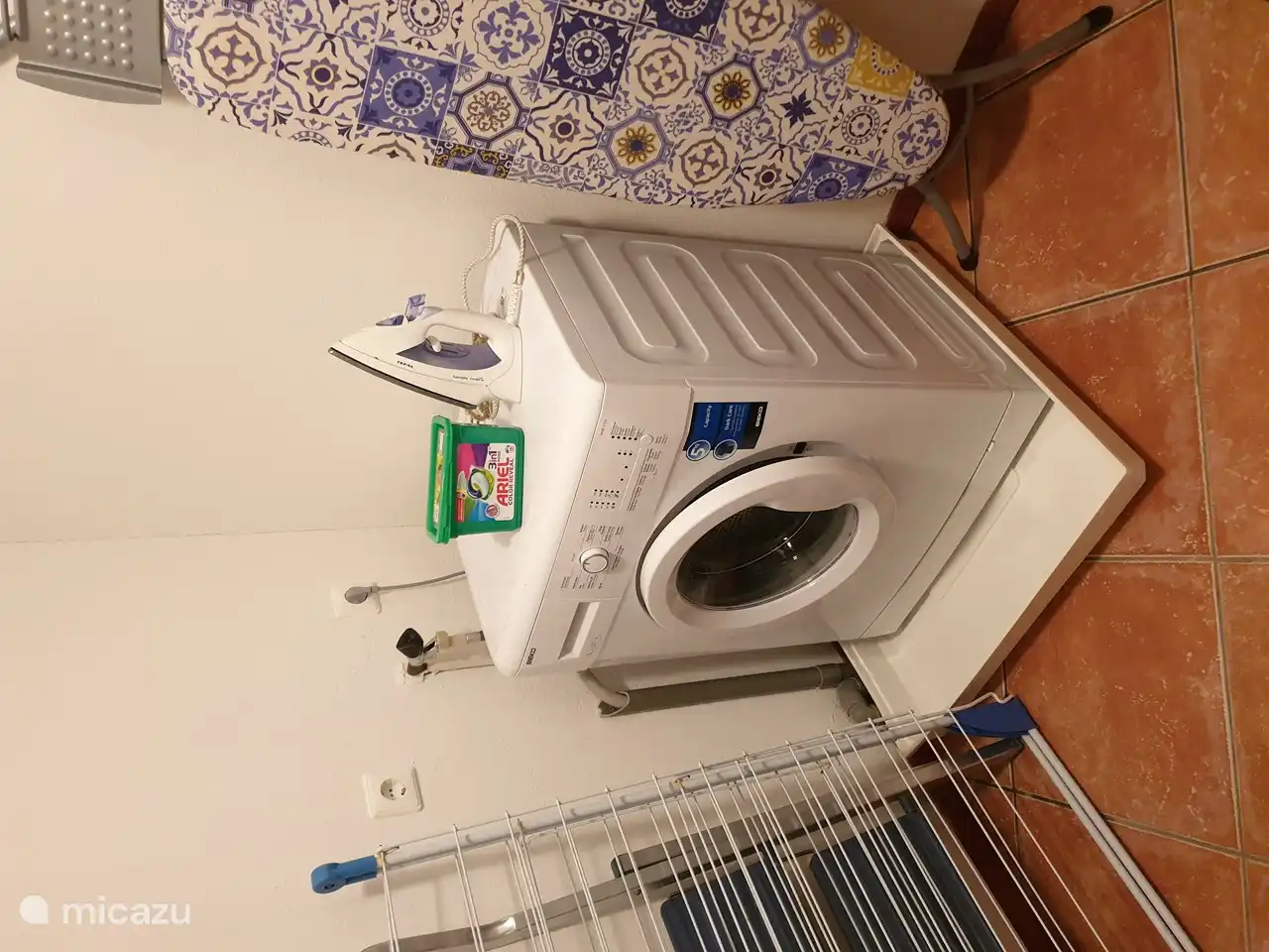 Utility Room: BBQ, washing machine, drying rack, clothespins, ironing board, iron, parasol, vacuum cleaner, cleaning utensils, shopping trolley and beach chairs.