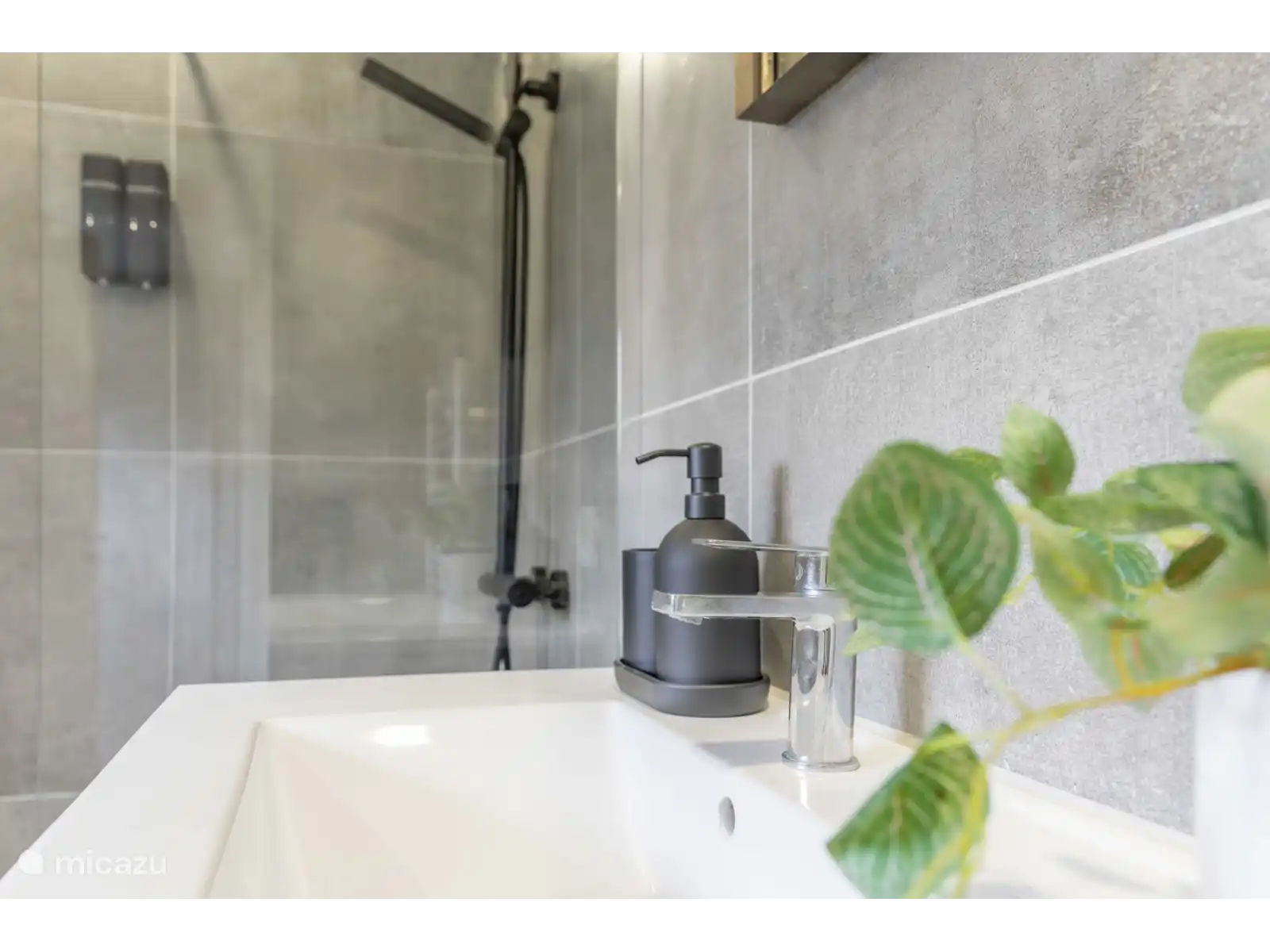 In the modern bathroom you will find a walk-in shower, bath, and sink. The toilet is separate.
