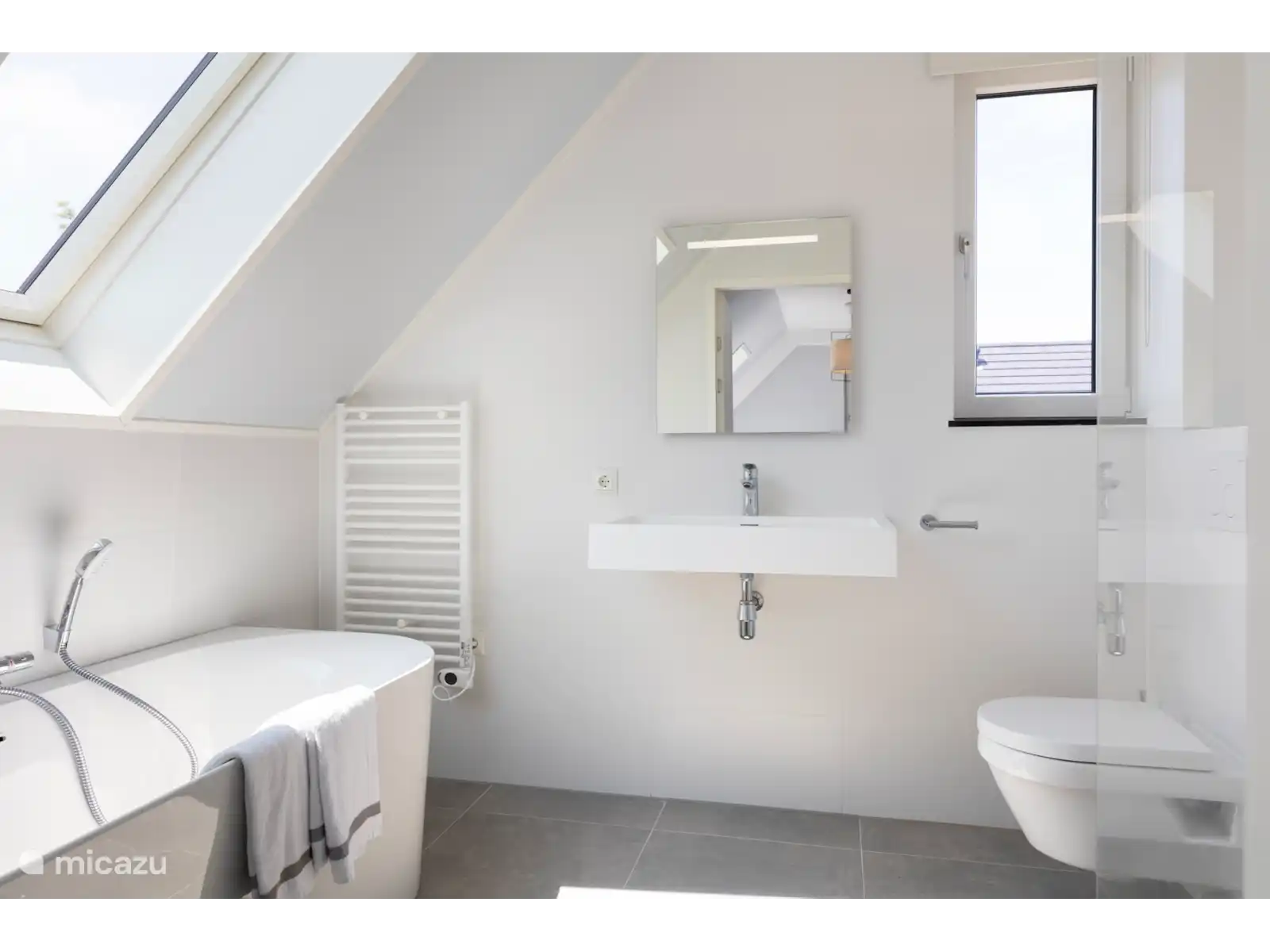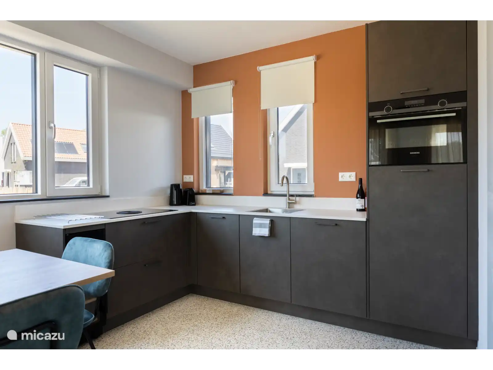The spacious living room has a bench (55 x 90 centimeters) and an attractive dining and sitting area, with smart TV with streaming option. The modern open kitchen has luxury appliances such as a Bora hob, combi oven, dishwasher, Nespresso machine and wine fridge. There is also a separate toilet.