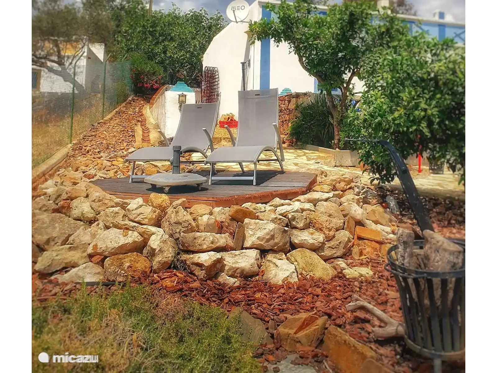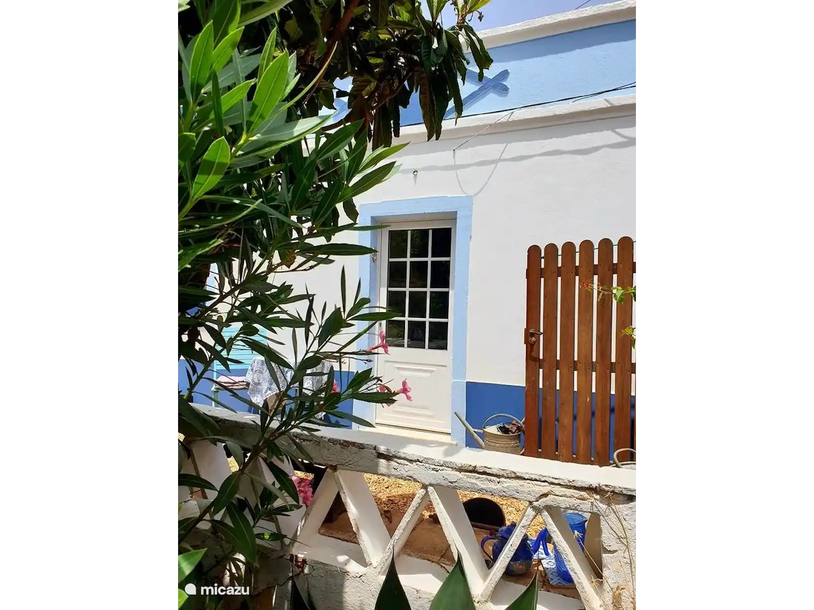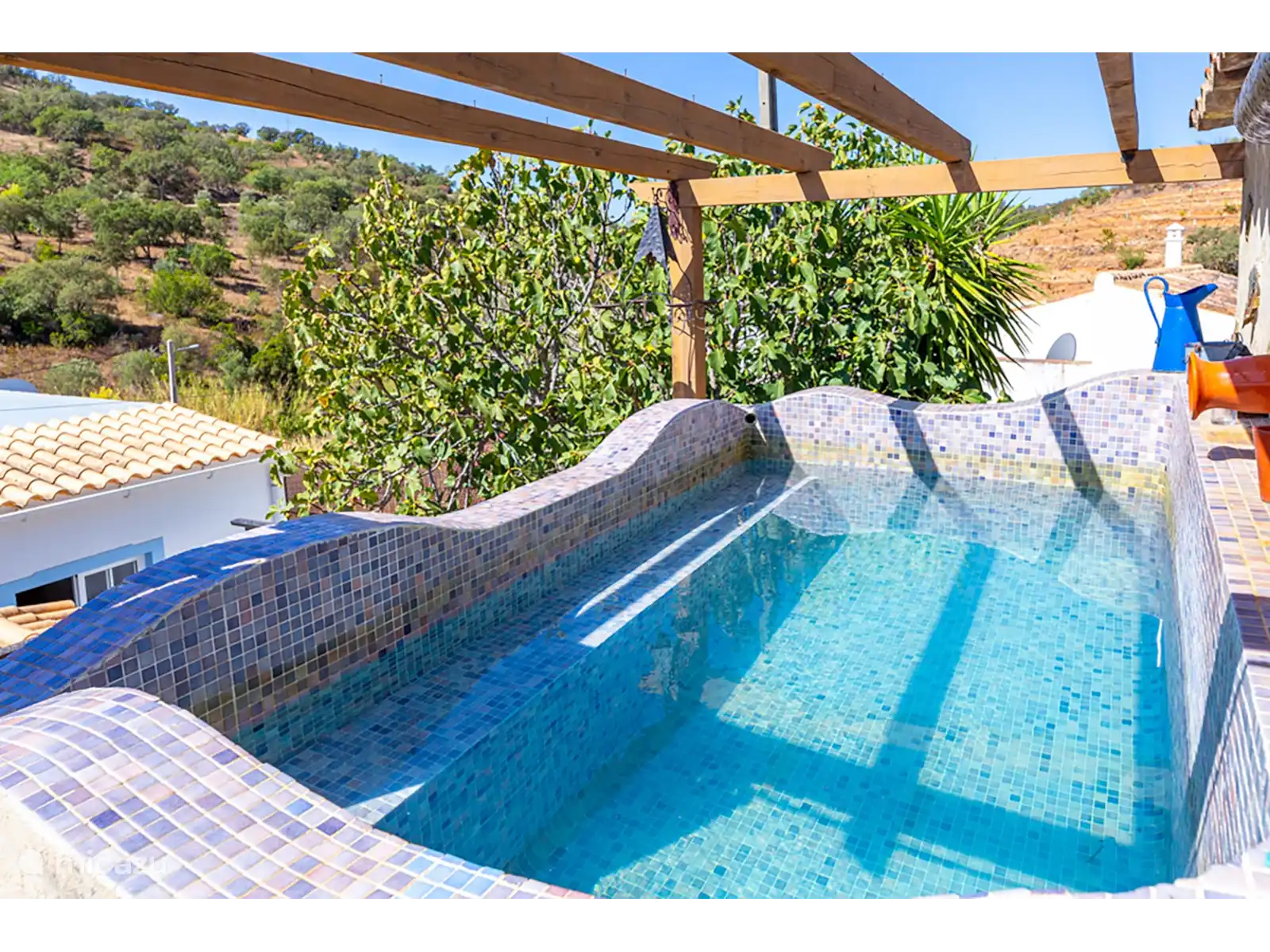 Enjoy modern comforts such as air conditioning, a non-frost fridge and a dishwasher, in beautifully decorated rooms. The open-plan living room includes a fully equipped kitchen and a bathroom with a rain shower. Outside, there's a private 6 sqm plunge pool and a beautifully landscaped garden, perfect for relaxation exclusively available to the guests. Dogs love it too! The patio terrace with a dining table overlooks a small river that borders the property. Guests are welcome to pick fresh oranges, grapes, and lemons from the garden.