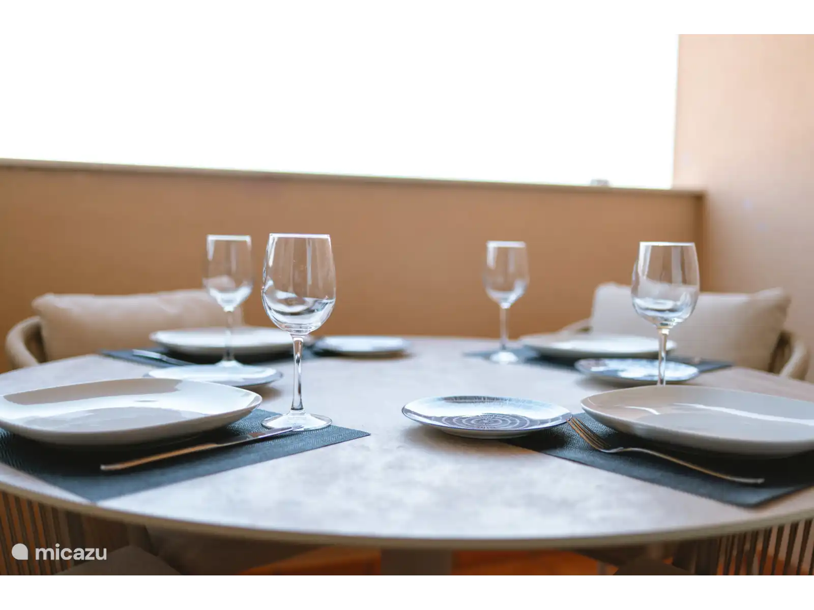 A 6-seater glass and dining service complete the kitchen. There is a breakfast bar with comfortable bar chairs. for 4 people.