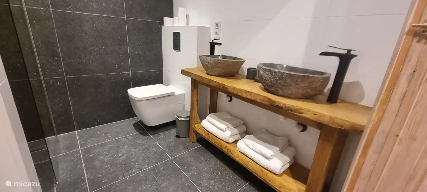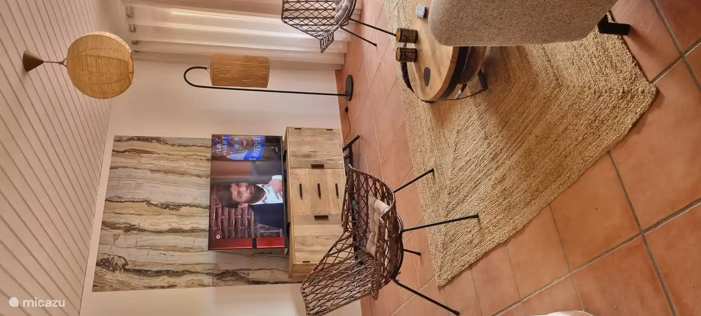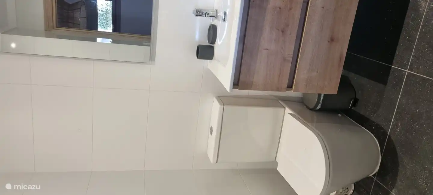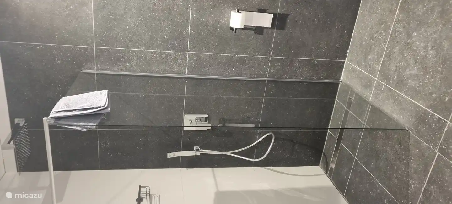 The cozy chic and very spacious living room is furnished with a round dining table with 4 chairs, a beautiful 3.5 person sofa, 2 relax chairs, 2 round coffee tables, a scaffolding wood TV cabinet with TV (internet/smart TV). There are two spacious bedrooms (1 with a double bed, 1 with two single beds that can of course be pushed together or separately). Both bedrooms have a wardrobe and an en-suite bathroom with a spacious walk-in shower and toilet. A hair dryer is available. On the terrace there is a beautiful table with 6 chairs, a lounge set and a parasol. The apartment has underfloor heating and air conditioning, there are blinds in front of the windows. Free WIFI available. Under the building is a closed garage with private parking.