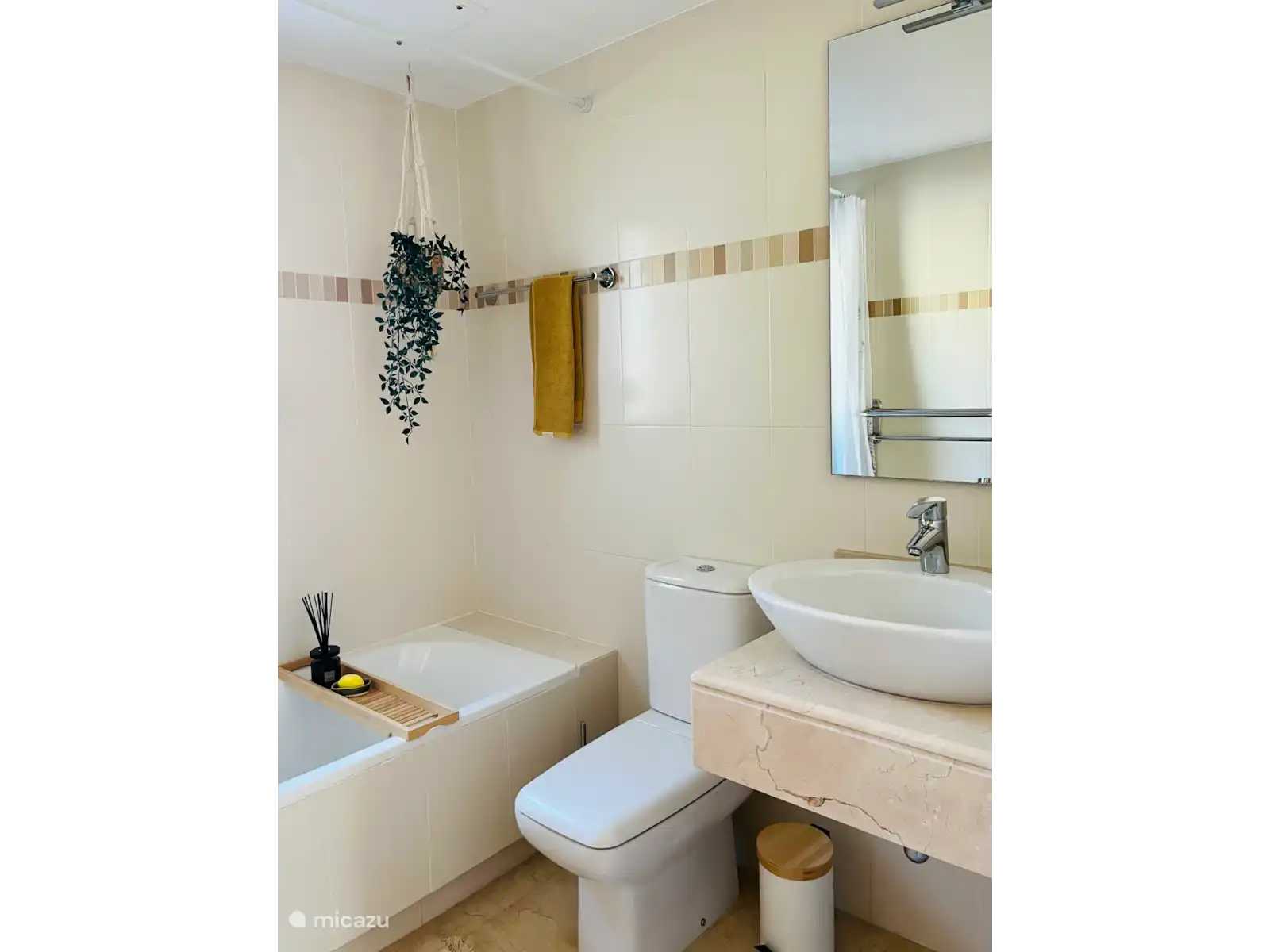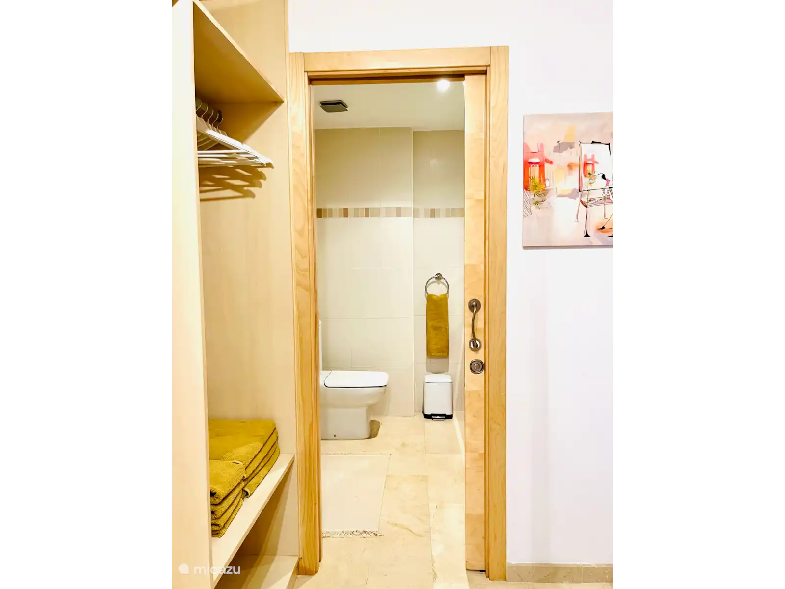 This lovely apartment with luxurious marble floors has a size of 85 m2. It consists of a spacious living room, equipped with two sofas with coffee table, a round dining table with four chairs and a modern wall unit. The smart TV has applications such as Netflix and NLZIET. Free Wi-Fi is available, so you can always stay connected during your stay. Climate control is available throughout the apartment.