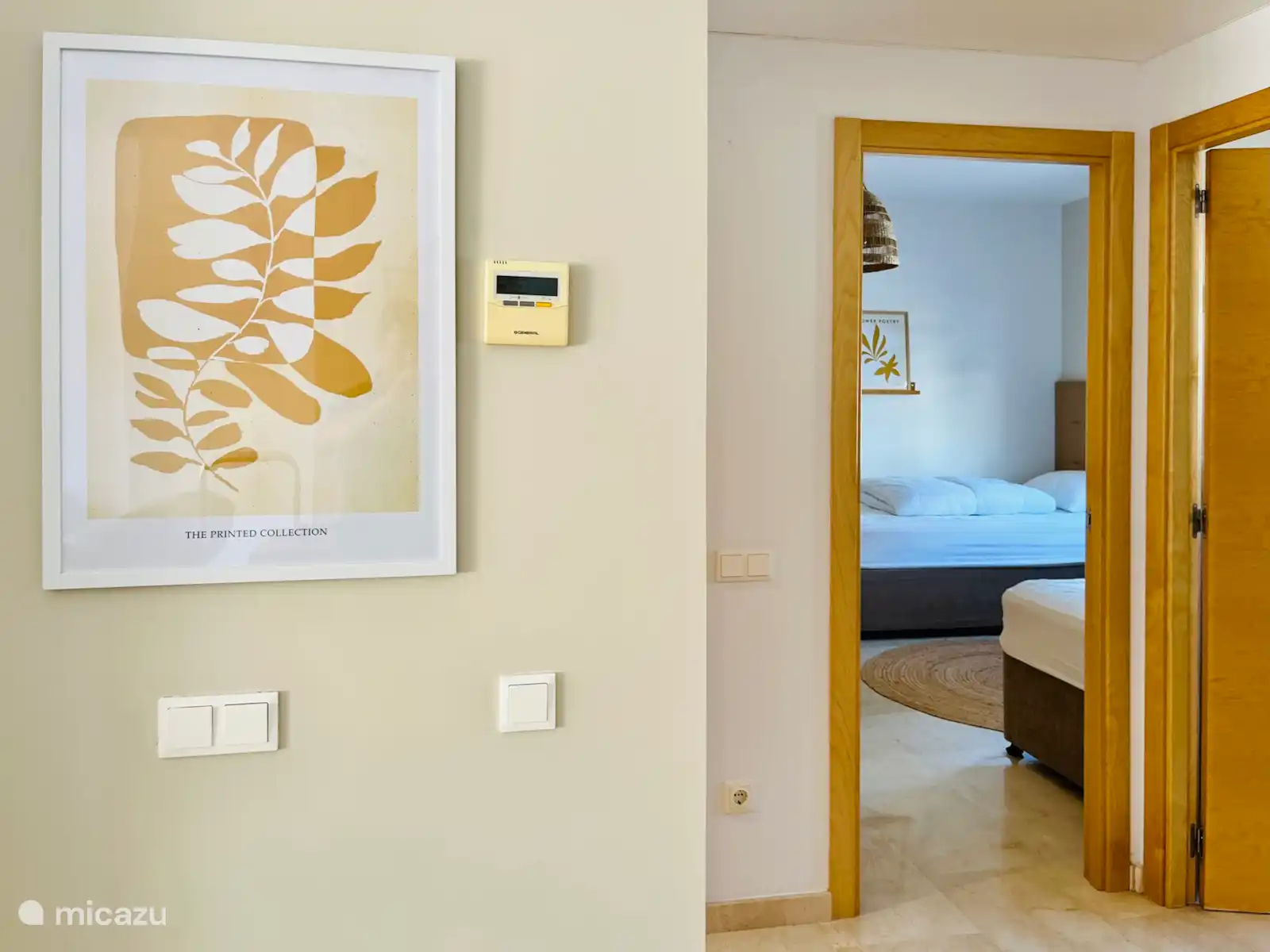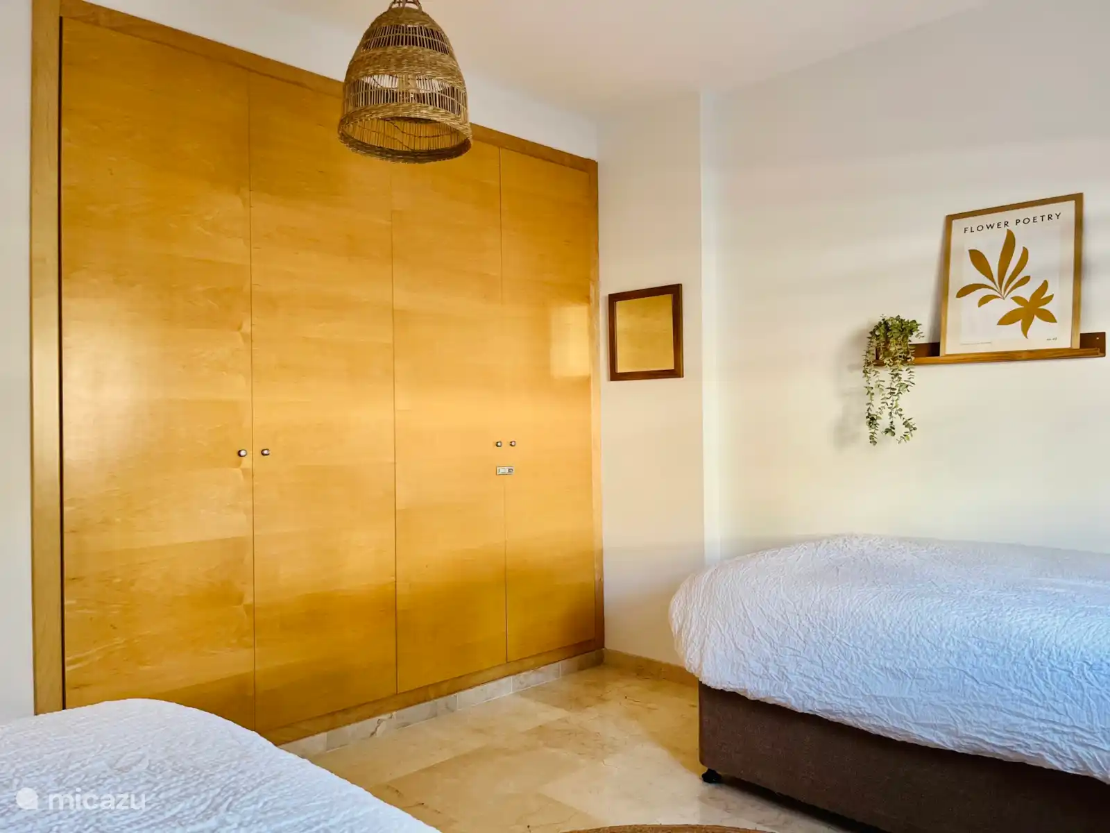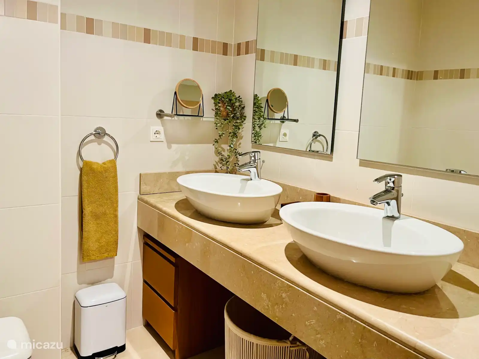 The bedrooms are tastefully decorated. The master bedroom with patio door has a double bed and a practical dressing room with passage to the private luxury bathroom. This is equipped with a spacious walk-in shower, marble washbasin with two washbasins, heated mirrors and toilet. The furniture has a hairdryer with diffuser.