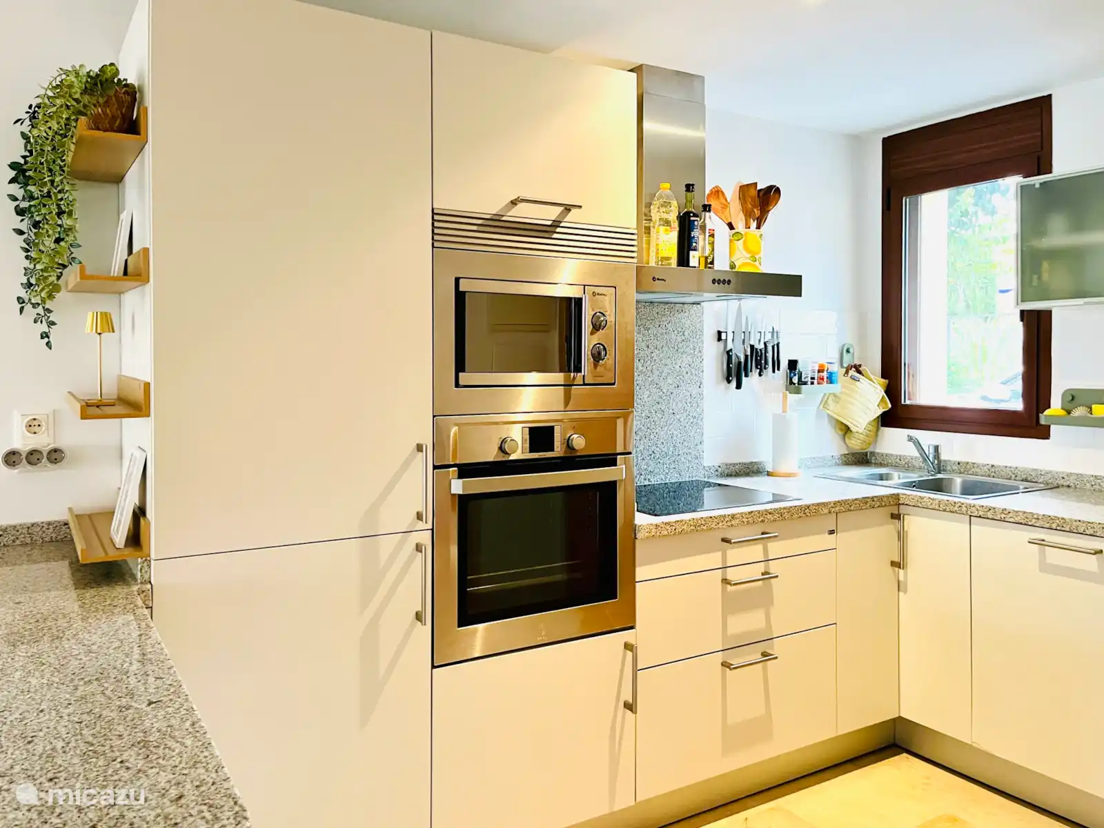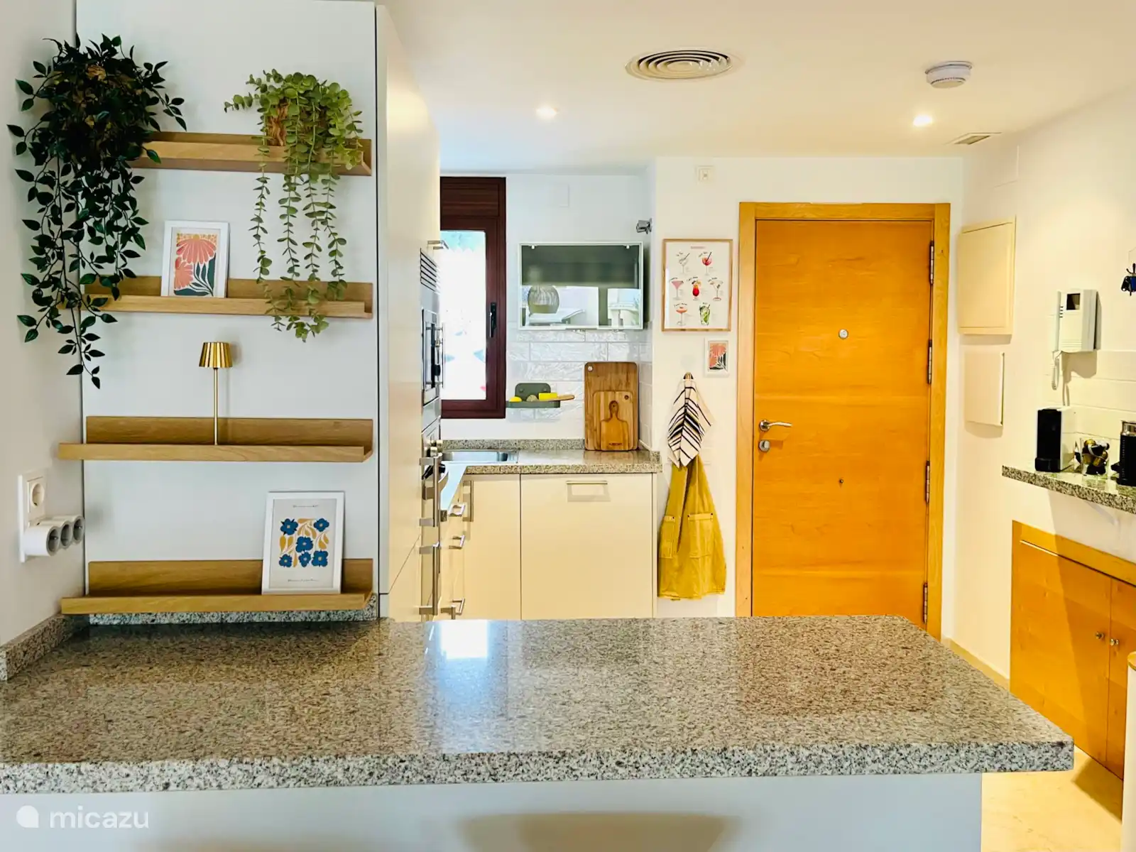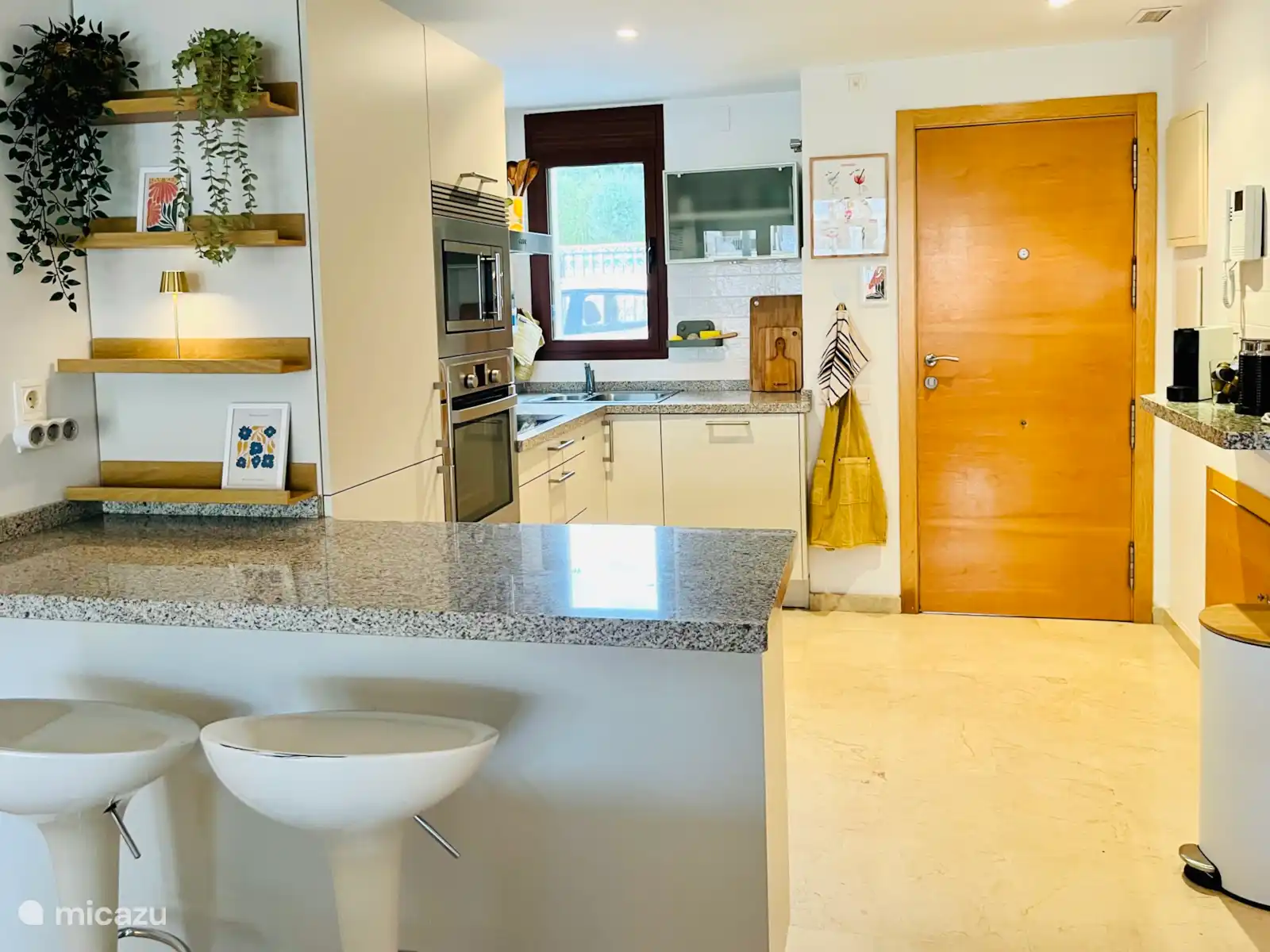 The open kitchen has a modern look and the bar with bar stools provides a cozy sitting/hanging area. The fully equipped kitchen with built-in appliances is equipped with many conveniences, including a dishwasher, 4-burner hob with extractor hood, fridge/freezer, oven and microwave. There is also a Nespresso coffee machine with milk frother, an electric kettle and a toaster. The apartment also has a washing machine with drying function, an ironing board and an iron.