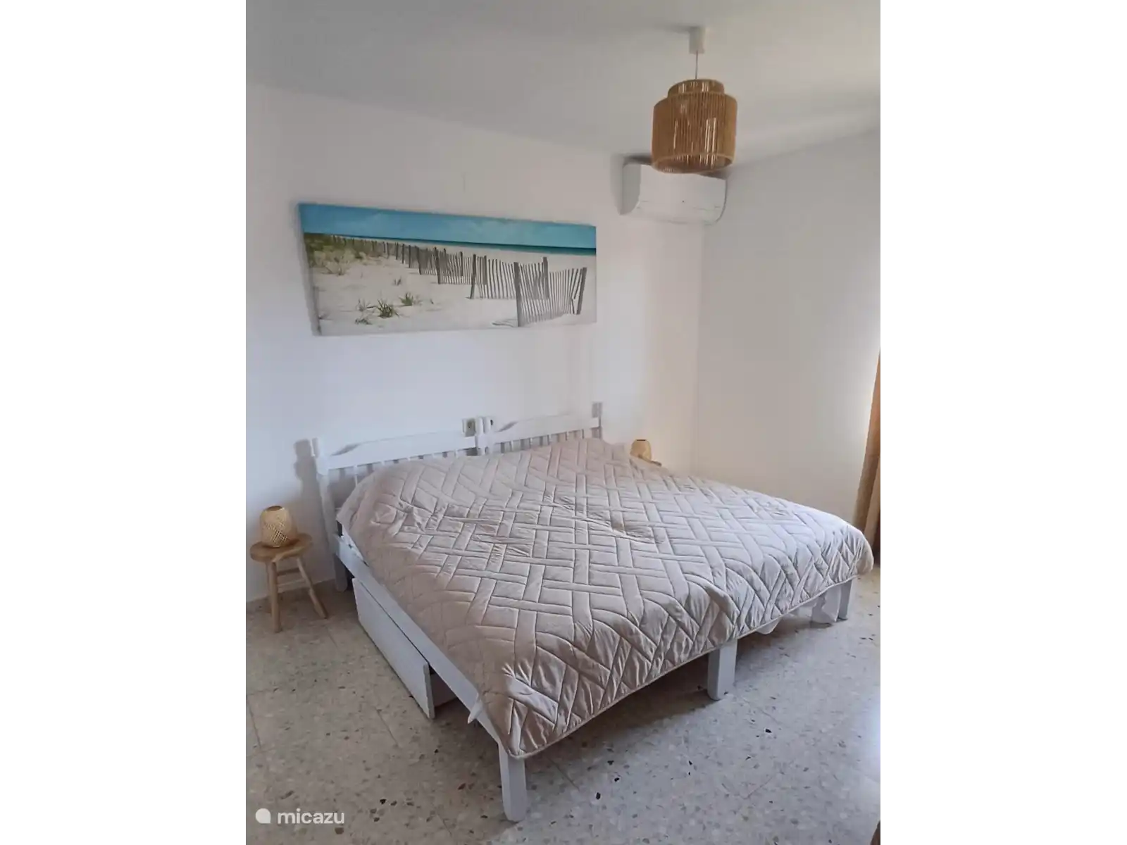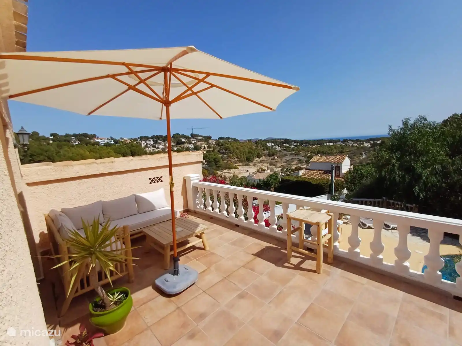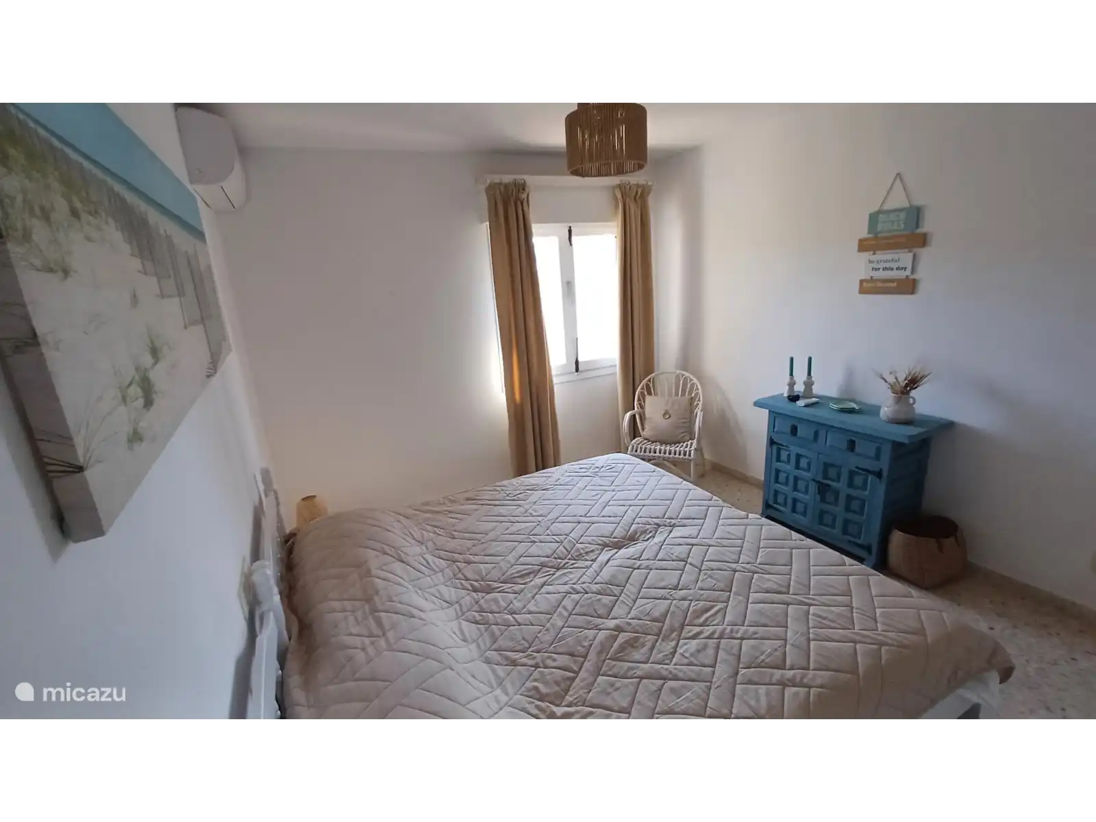 The two spacious bedrooms are also on the ground floor and have fitted wardrobes and are equipped with air conditioning. One of the bedrooms has an ensuite bathroom. Next to the kitchen is an internal staircase that leads to the bright and spacious living room with TV. There is a desk with screen and keyboard for hybrid working. Double glass doors open to a large terrace with lounge sofa and a beautiful view of the sea.
