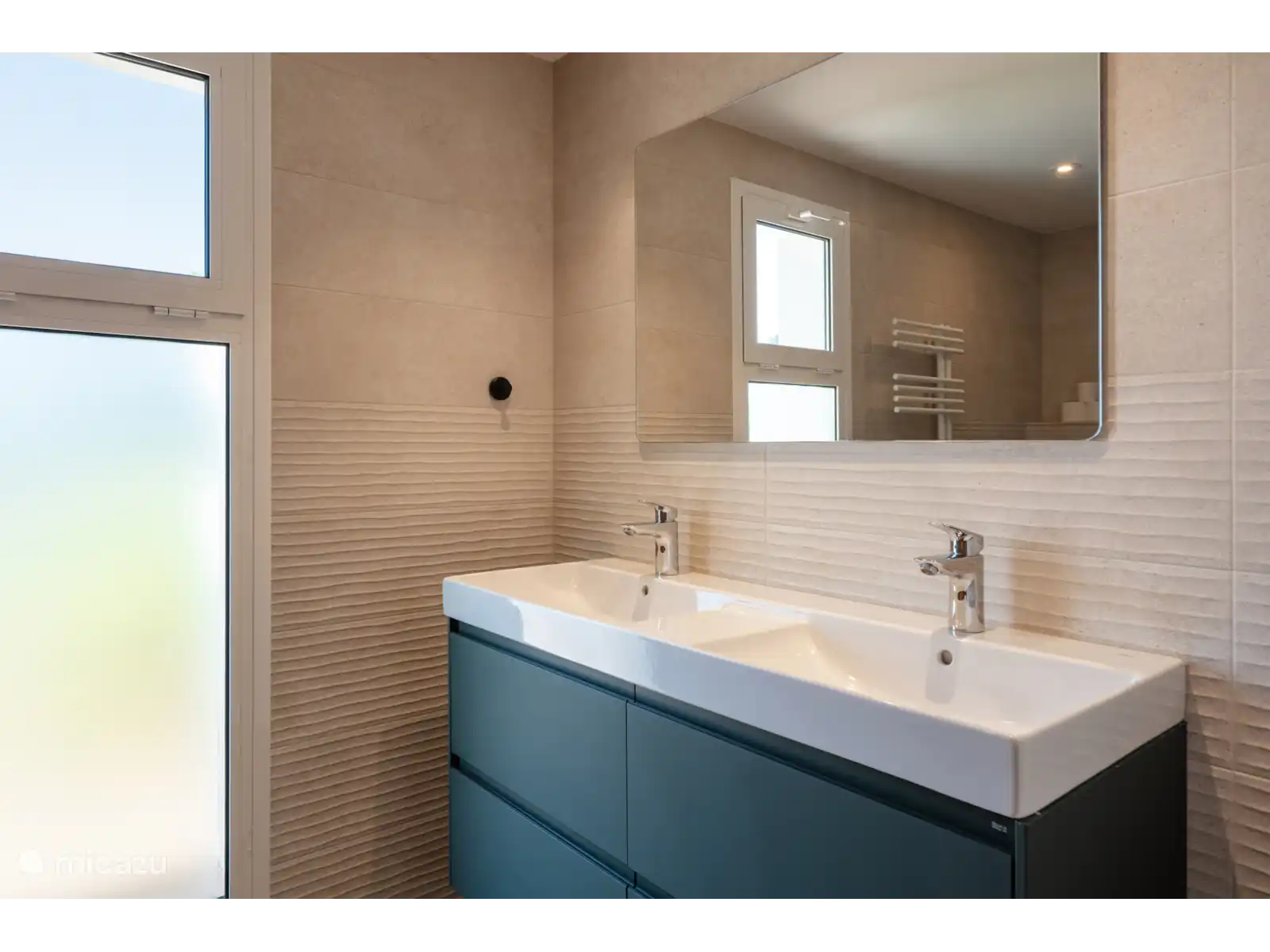 On the upper floor is the spacious master bedroom with bathroom en suite, supplemented by two bedrooms and a separate bathroom. Downstairs are two more bedrooms: one with bathroom en suite and one with a separate bathroom. The downstairs bedrooms can also be reached from the outside, which provides extra privacy. All rooms are air-conditioned.