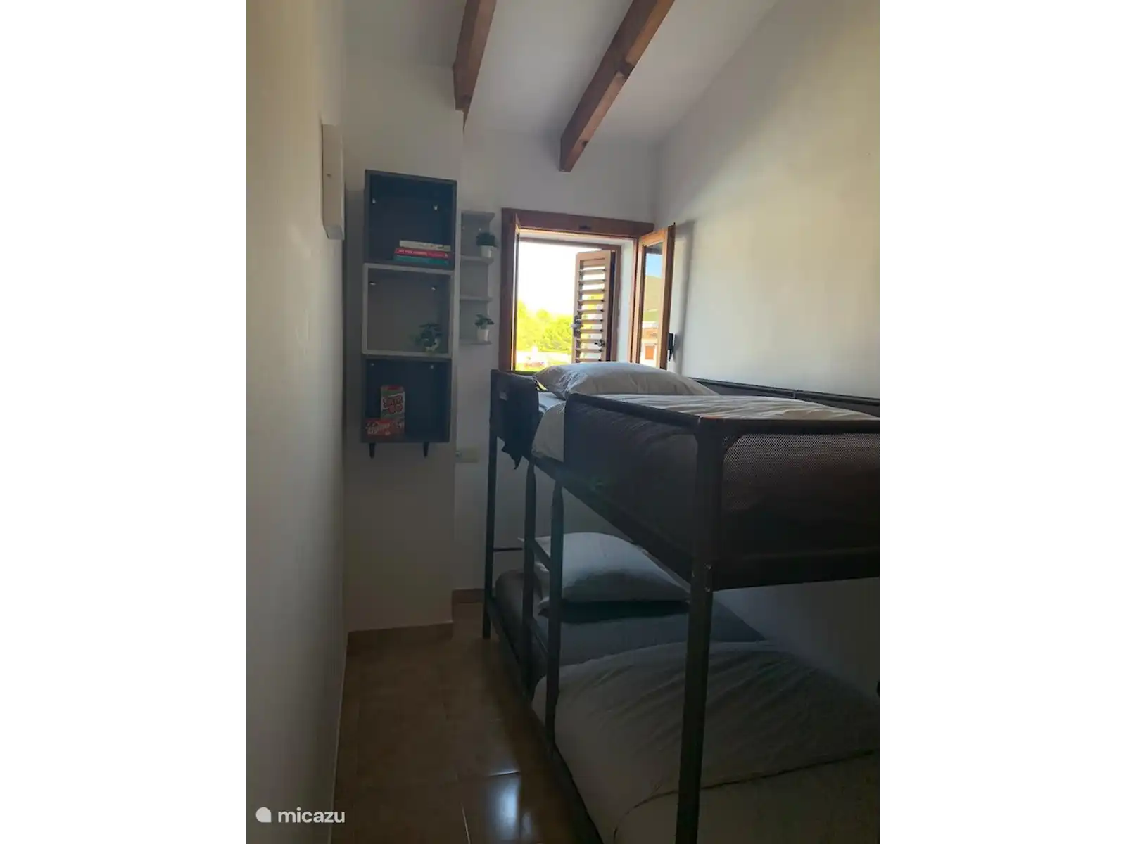The 3rd bedroom has a bunk bed with built-in wardrobe and air conditioning (hot/cold). The shutters are also present here.