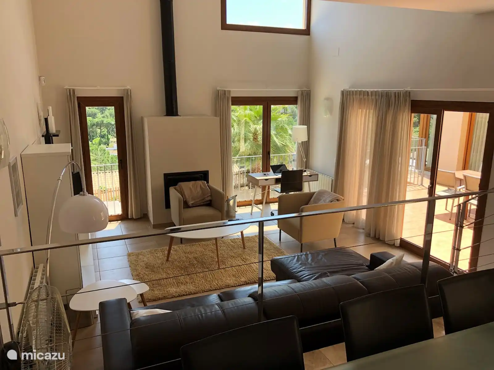Going down the stairs you enter the living room with an open plan modern kitchen.