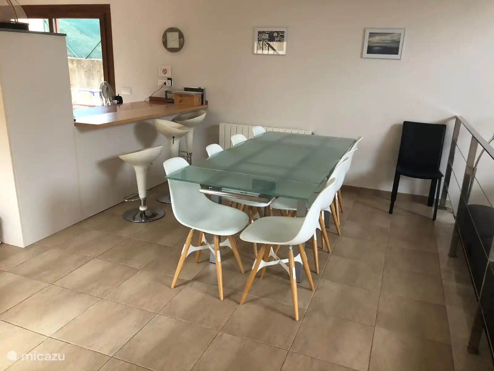 Dining table: attached to the kitchen is a glass dining table with 8 chairs