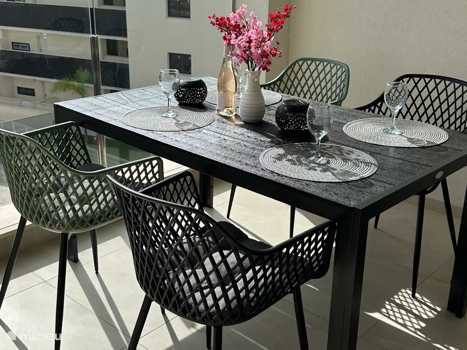 The spacious balcony is furnished with 2 luxury sunbeds, a dining table with 4 chairs and a cozy bench – perfect for enjoying a drink, the sun or a good book.