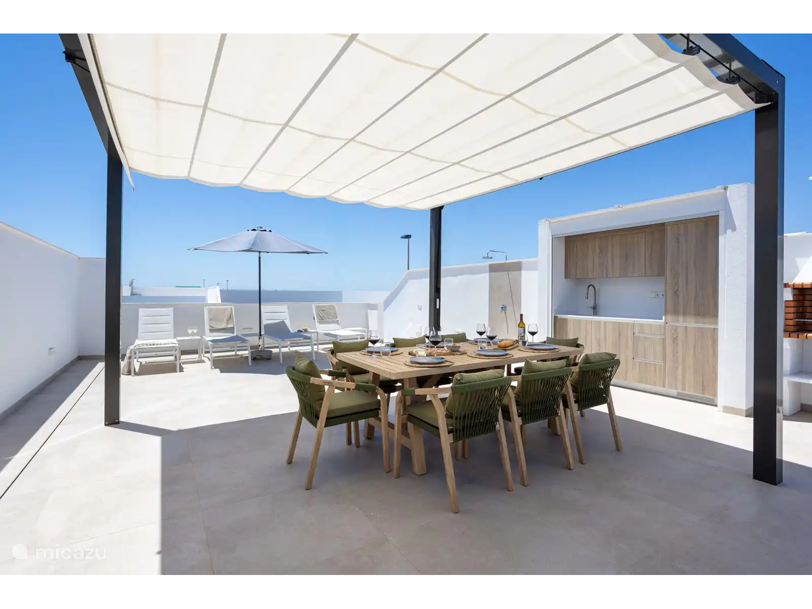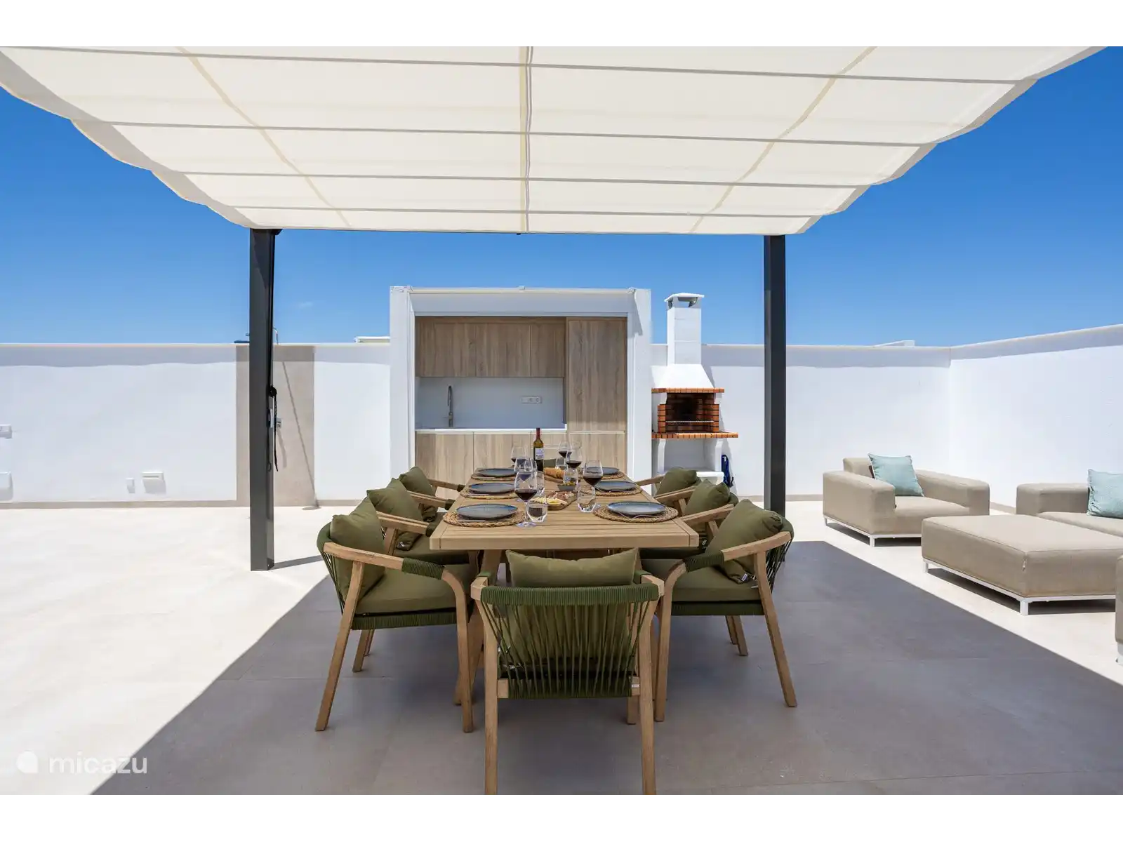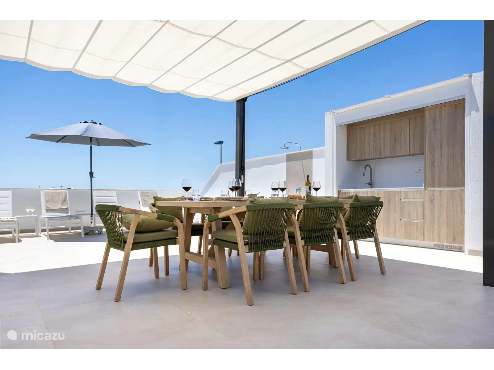 Make the most of the rooftop terrace and soak up the sun with a cold drink from the fridge. The fully equipped outdoor kitchen with fridge, freezer, dishwasher, glasses, plates and cutlery lets you enjoy Spanish life even more.