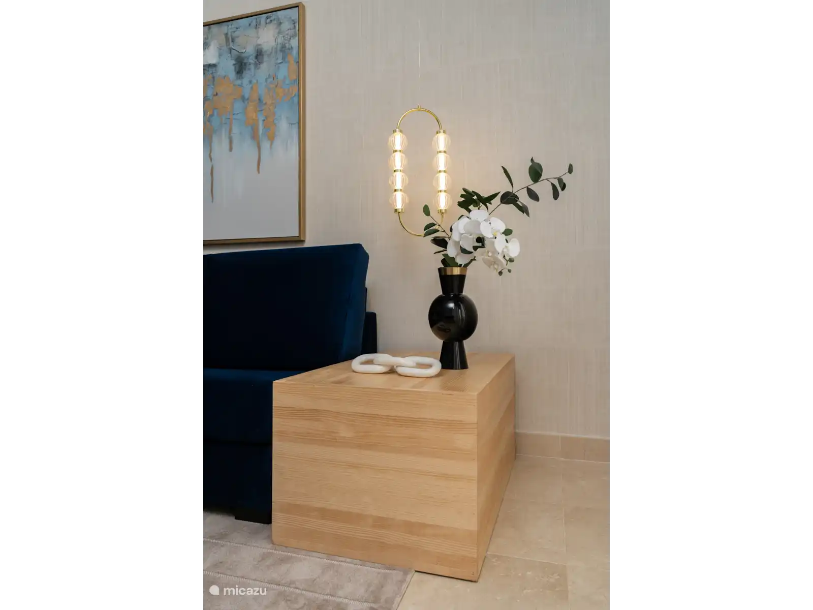 In the living room there is a beautiful sofa that can also be used as a sofa bed. There is a 65 inch TV.