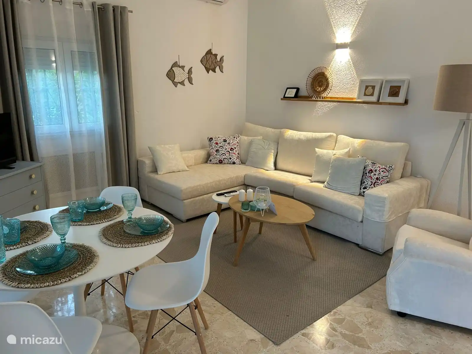 The apartment can be rented with a maximum of 4 adults. There may be a possibility. an extra mattress can be placed for a 5th person. It has a living room, separate kitchen, outdoor terrace and a covered terrace with patio doors to the garden. Here you can enjoy the sun all day long, even in winter. In addition, it has 2 bedrooms with a Karlsson box spring bed in each room. The largest bedroom has a spacious bathroom with shower and toilet, the 2nd bedroom has a smaller bathroom with toilet and washbasin. There is an air conditioning/heating unit in all rooms.