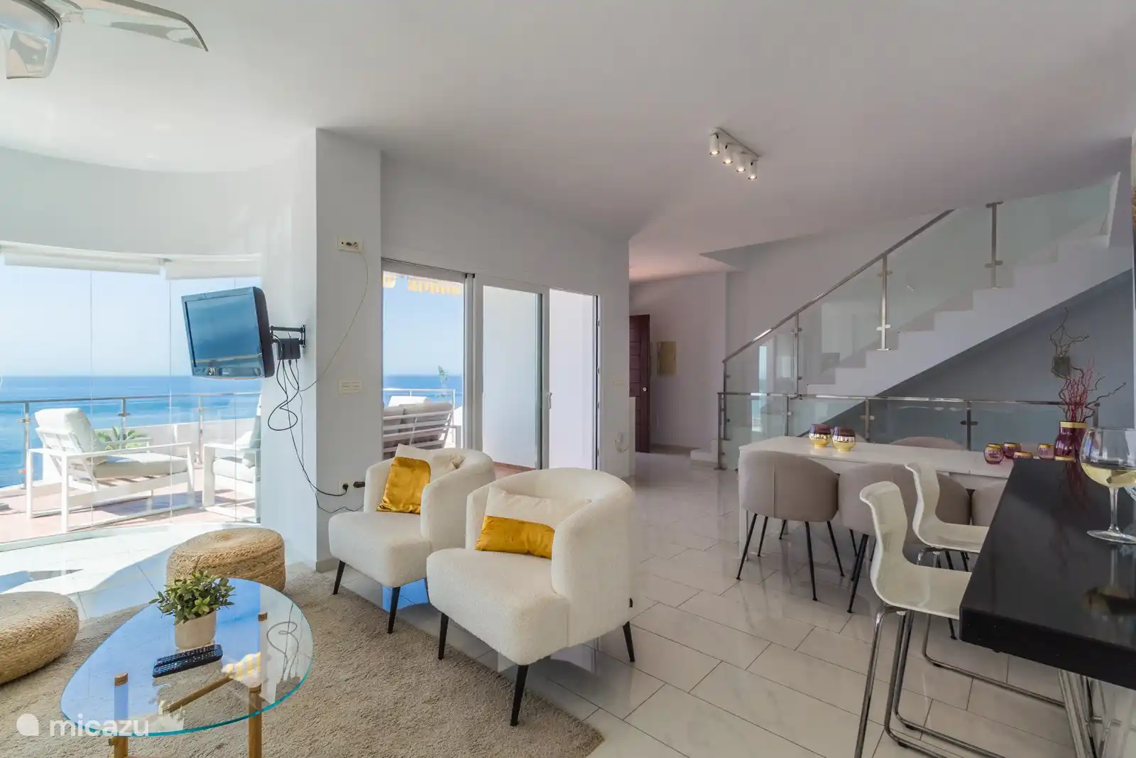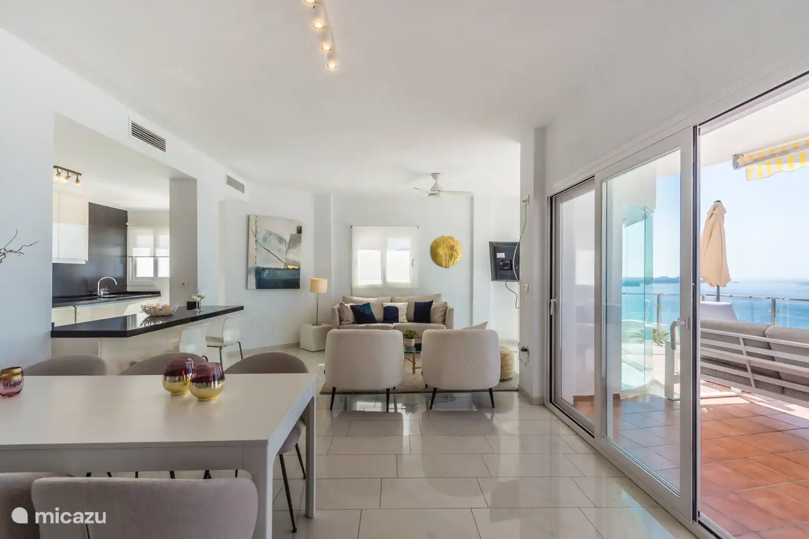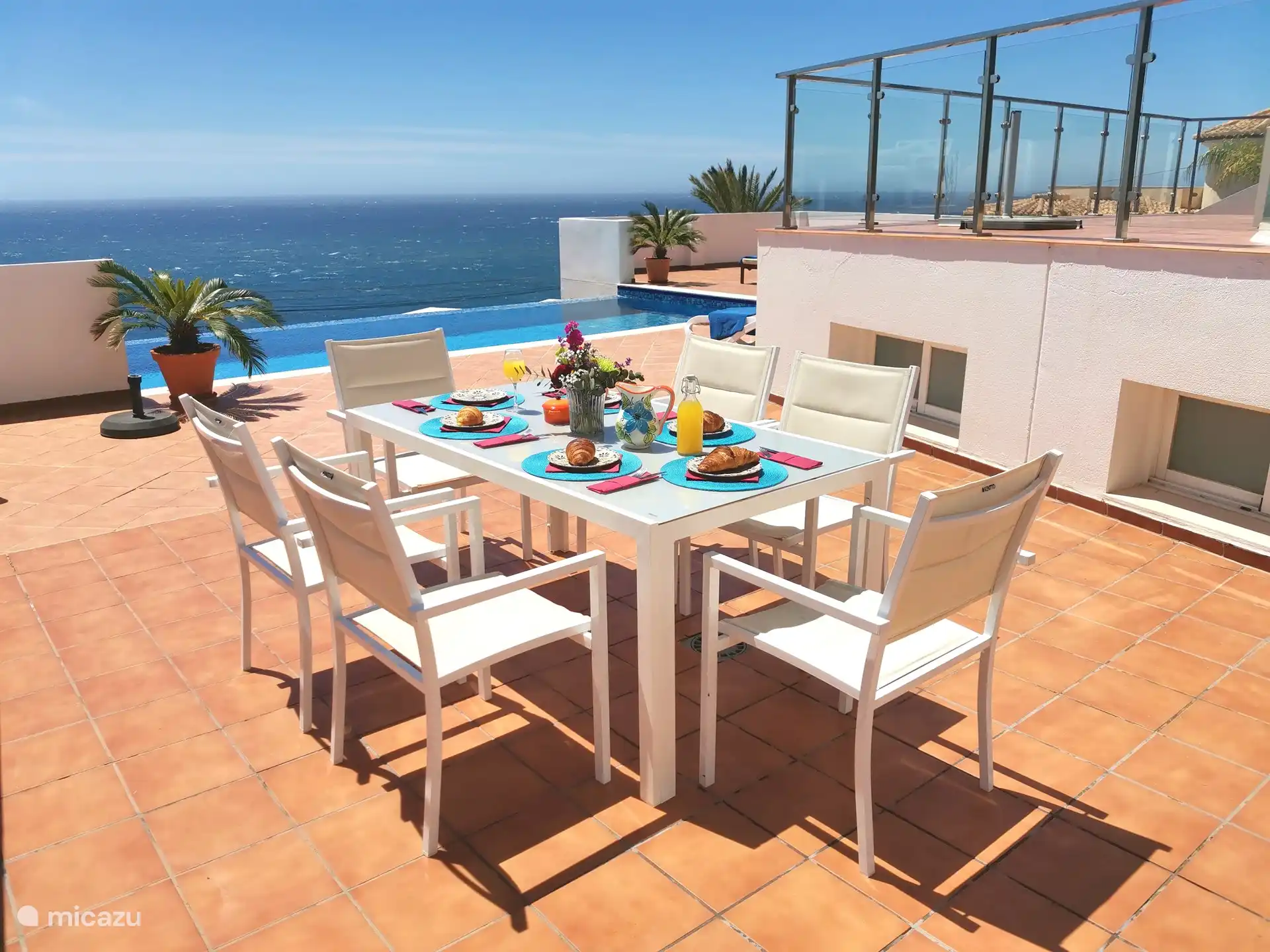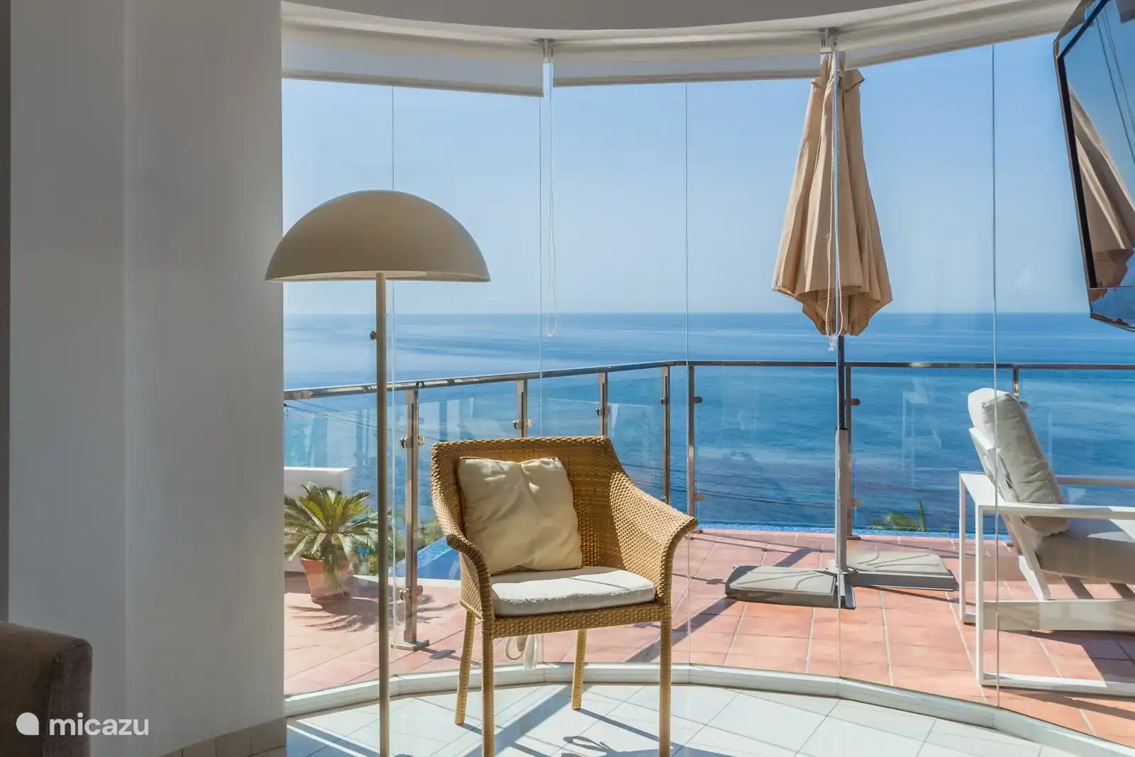 - spacious, open-plan large room, which serves as a living and dining room, with high ceilings, a 4.4-meter sliding glass door and 9 glass block windows allowing one to enjoy the beautiful cobalt blue sky of Andalusia also from the villa- The terrace is perfect for enjoying breakfast or a drink while taking in the beautiful views.