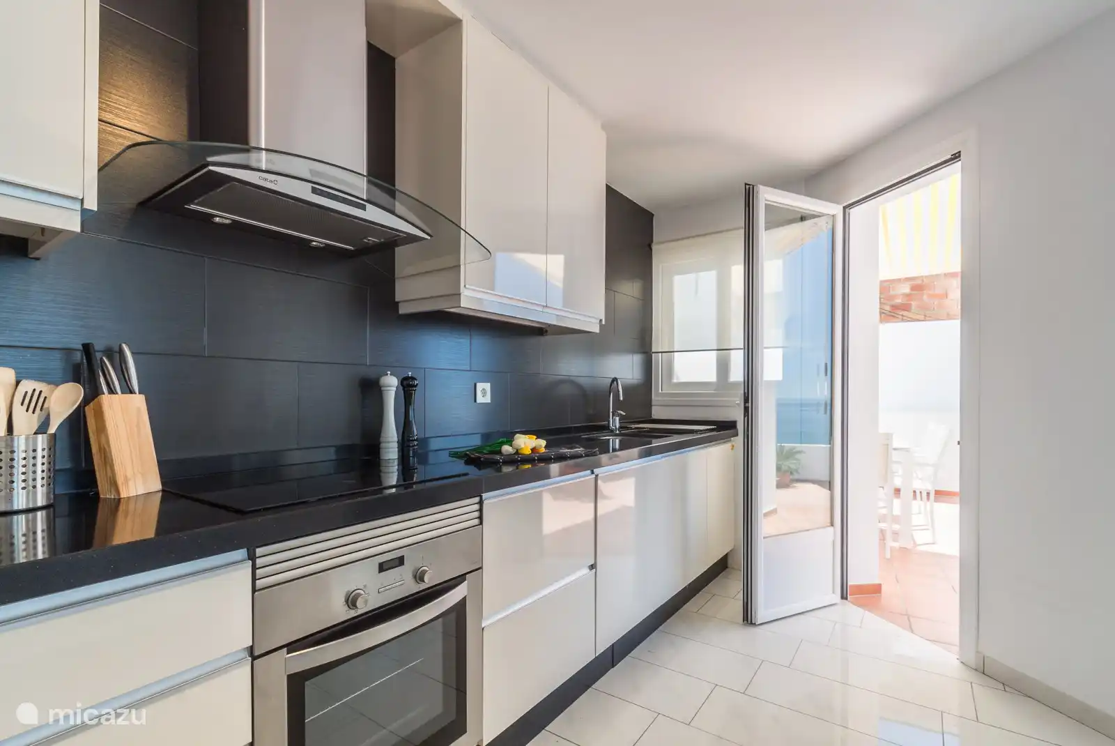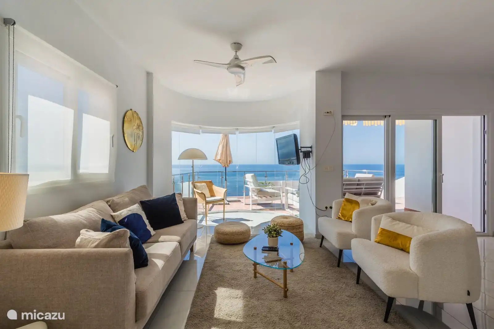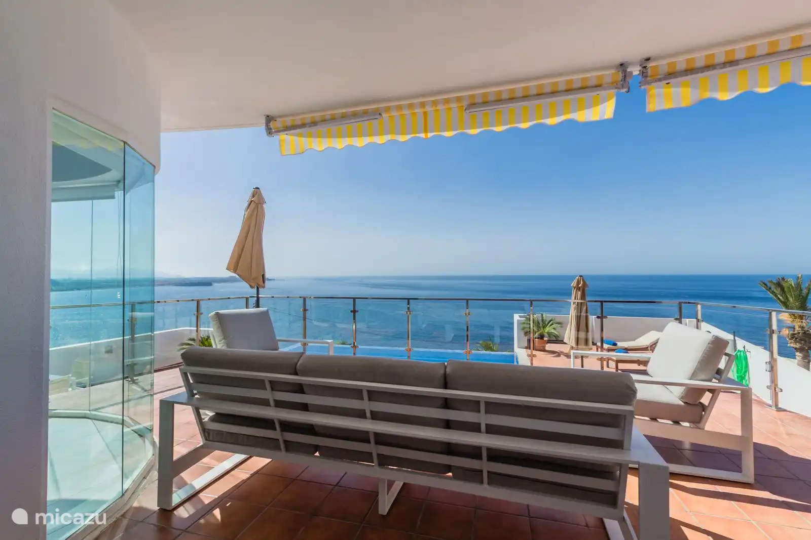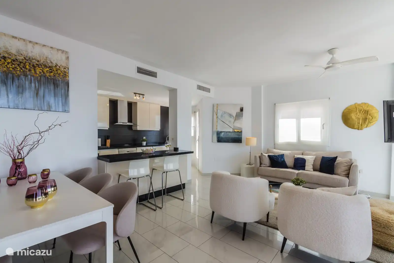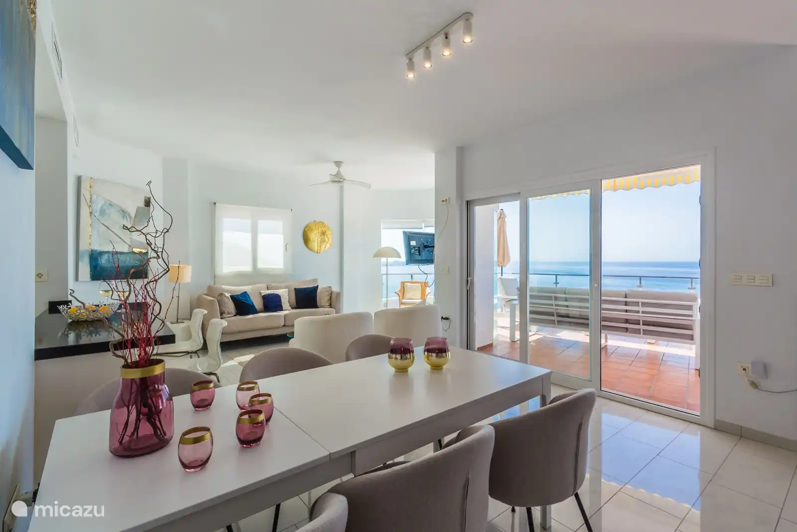 - spacious, open-plan large room, which serves as a living and dining room, with high ceilings, a 4.4-meter sliding glass door and 9 glass block windows allowing one to enjoy the beautiful cobalt blue sky of Andalusia also from the villa- The terrace is perfect for enjoying breakfast or a drink while taking in the beautiful views.