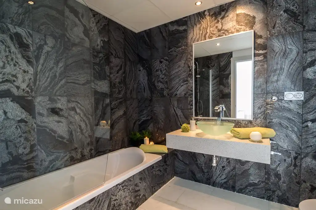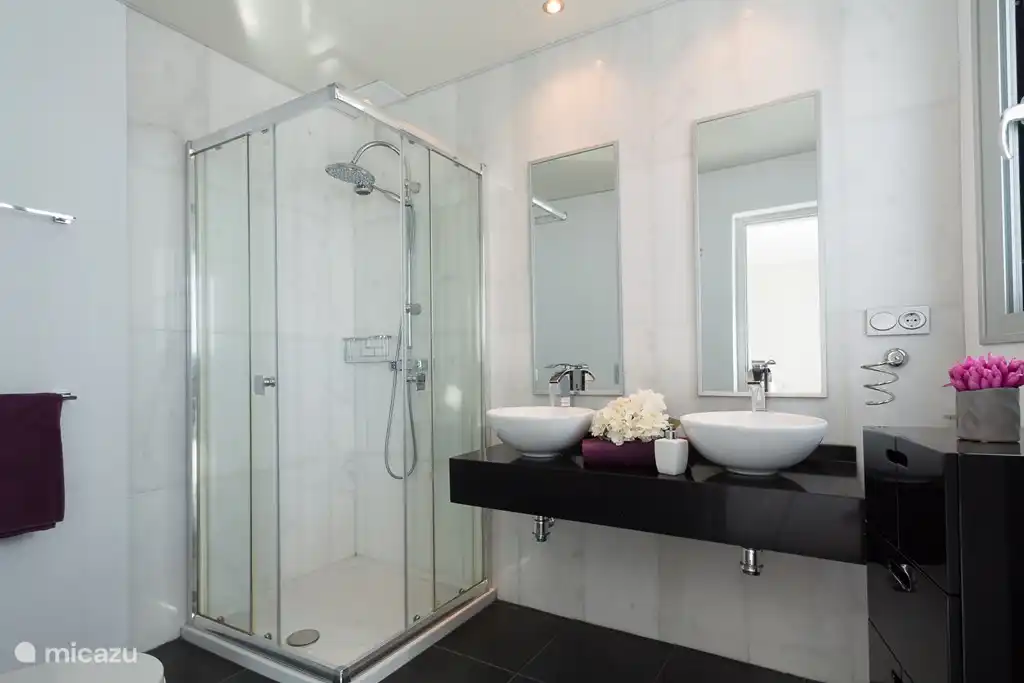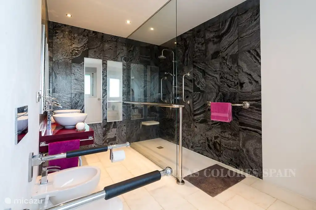With the stairs or elevator you go to the ground floor where there are another 4 spacious 2-person bedrooms, each with a tasteful en suite bathroom. All bathrooms have double sinks and a relaxing rain shower. Two bedrooms have a king size bed and two bedrooms have 2 single beds. The bedrooms have beautiful fitted wardrobes.