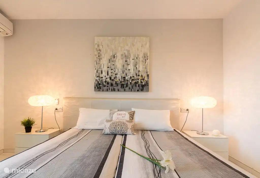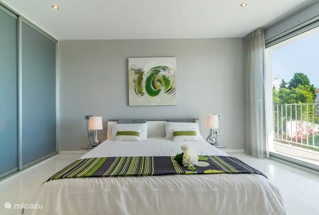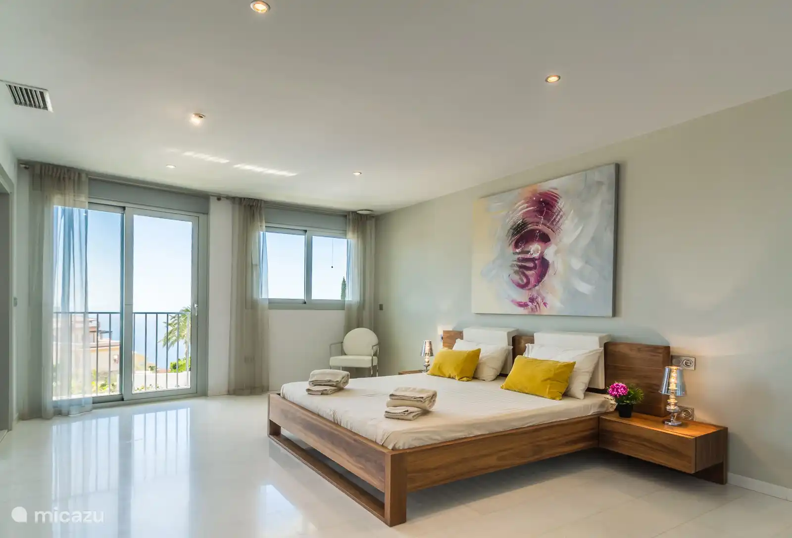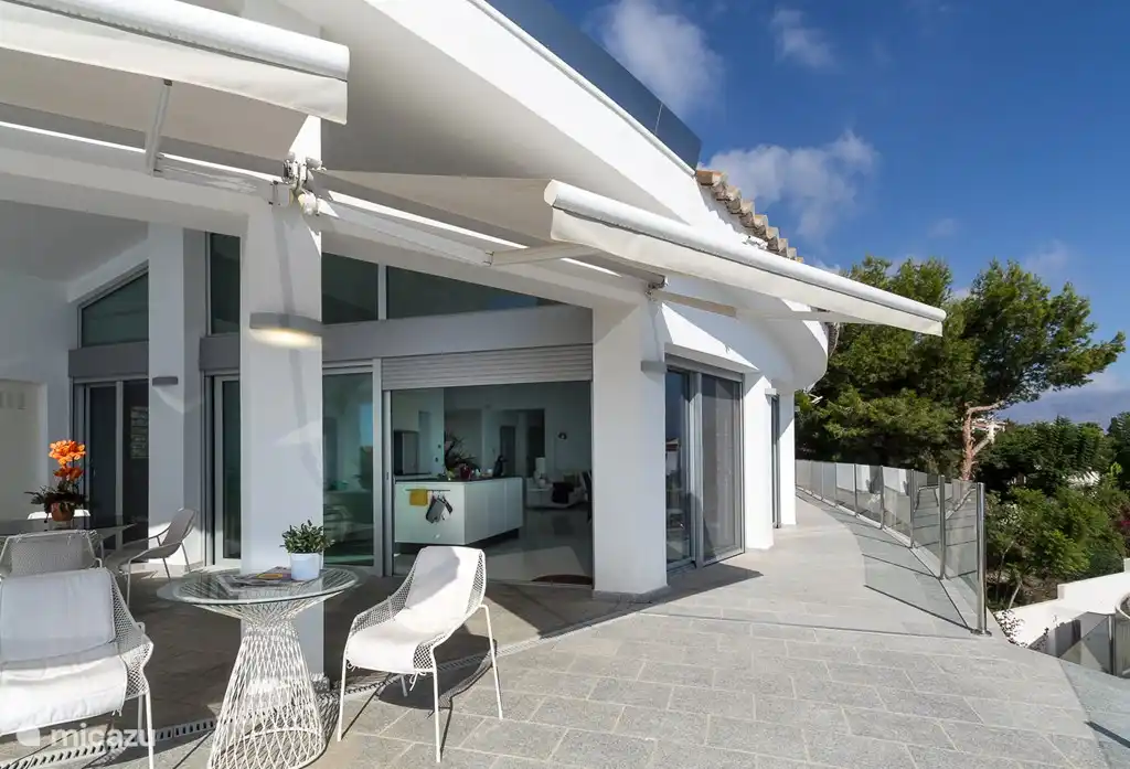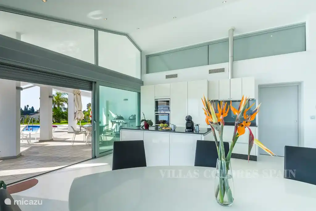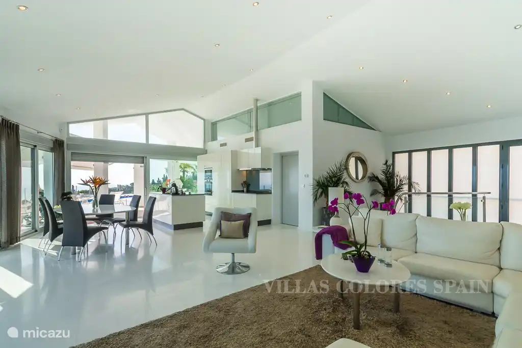 The spacious, modern living room has a comfortable sitting area. There is widescreen satellite TV with a large number of European and international channels as well as WIFI. The open kitchen with work island is fully equipped, so you can prepare delicious Spanish dishes, where you can prepare the fresh fish on the spacious gas BBQ on the terrace. At the covered outdoor table you can dine for hours and enjoy the beautiful Spanish wines and the grandiose view.