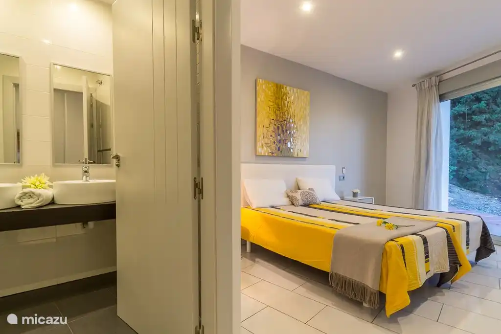 On the same floor as the living room is the master bedroom with a king size bed (1.80 x 2.00m) and an en suite bathroom of beautiful natural stone. This spacious bedroom and bathroom are ideal for people in wheelchairs. The first floor has a second bedroom with a double bed and a separate bathroom. The laundry room with washing machine and dryer is also on this floor.