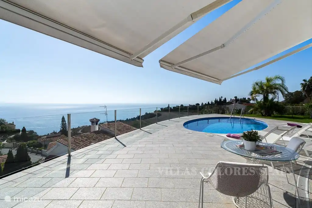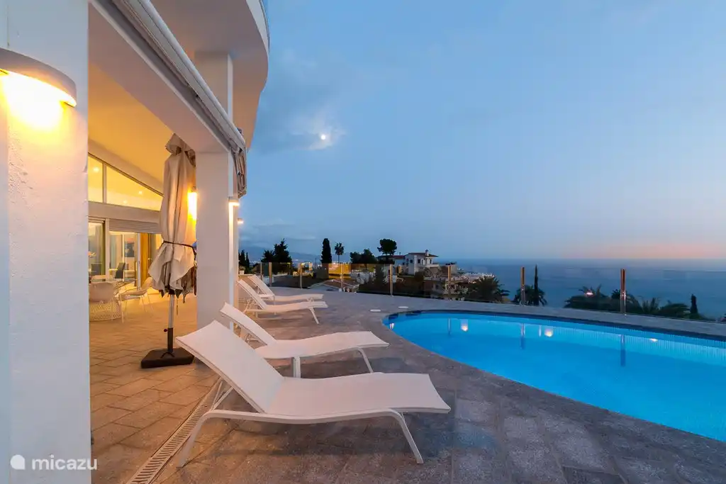 The architecture of this beautiful, modern villa allows the generous bright interior space to flow seamlessly into the sunny outdoor area. The villa with white marble floors is remarkably light and has a fabulous view of the Mediterranean Sea, the mountains of the Sierra Nevada with the snowy peaks in winter and the picturesque town of Salobreña with the 13th century Moorish castle built on the rock, which is illuminated at night. The villa is south facing, so you can enjoy the Spanish sun from sunrise to sunset. The villa has a heated private swimming pool and a spacious terrace, part of which is covered, so that you can relax for hours in both the sun and the shade and enjoy the beautiful views. There is a bathroom on the terrace. The villa has an elevator and is fully accessible for people in wheelchairs.