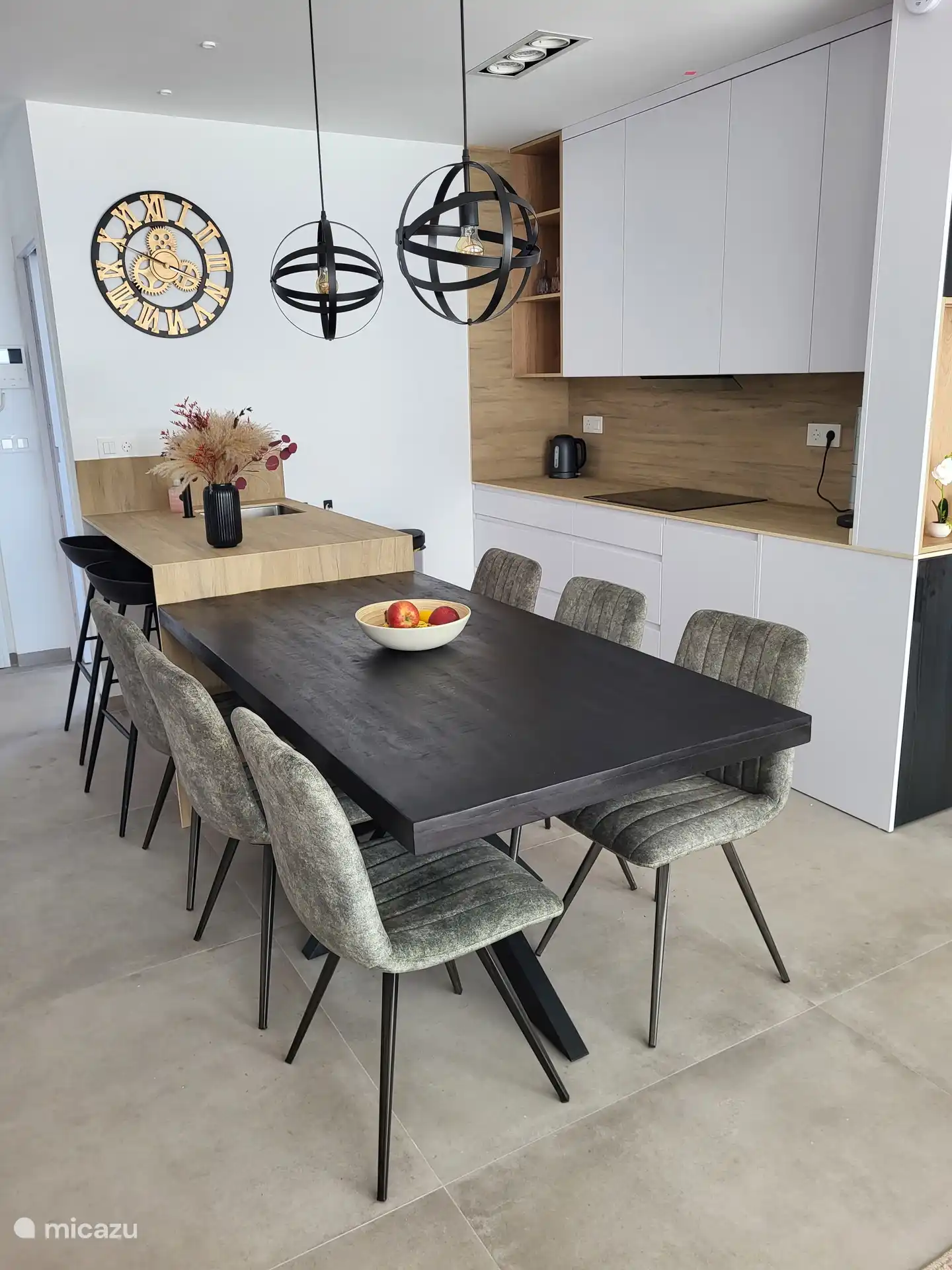 The apartment offers space for max. 6 people and is equipped with every luxury and many conveniences. The complex consists of 24 houses with a communal swimming pool (25 meters) in the middle with a deep and shallow part. In winter, the pool is heated. The house has 3 bedrooms, 2 bathrooms, 1 en suite in the master room. Furthermore, the apartment has a lovely large terrace where you can sit in the sun and in the shade all day long.