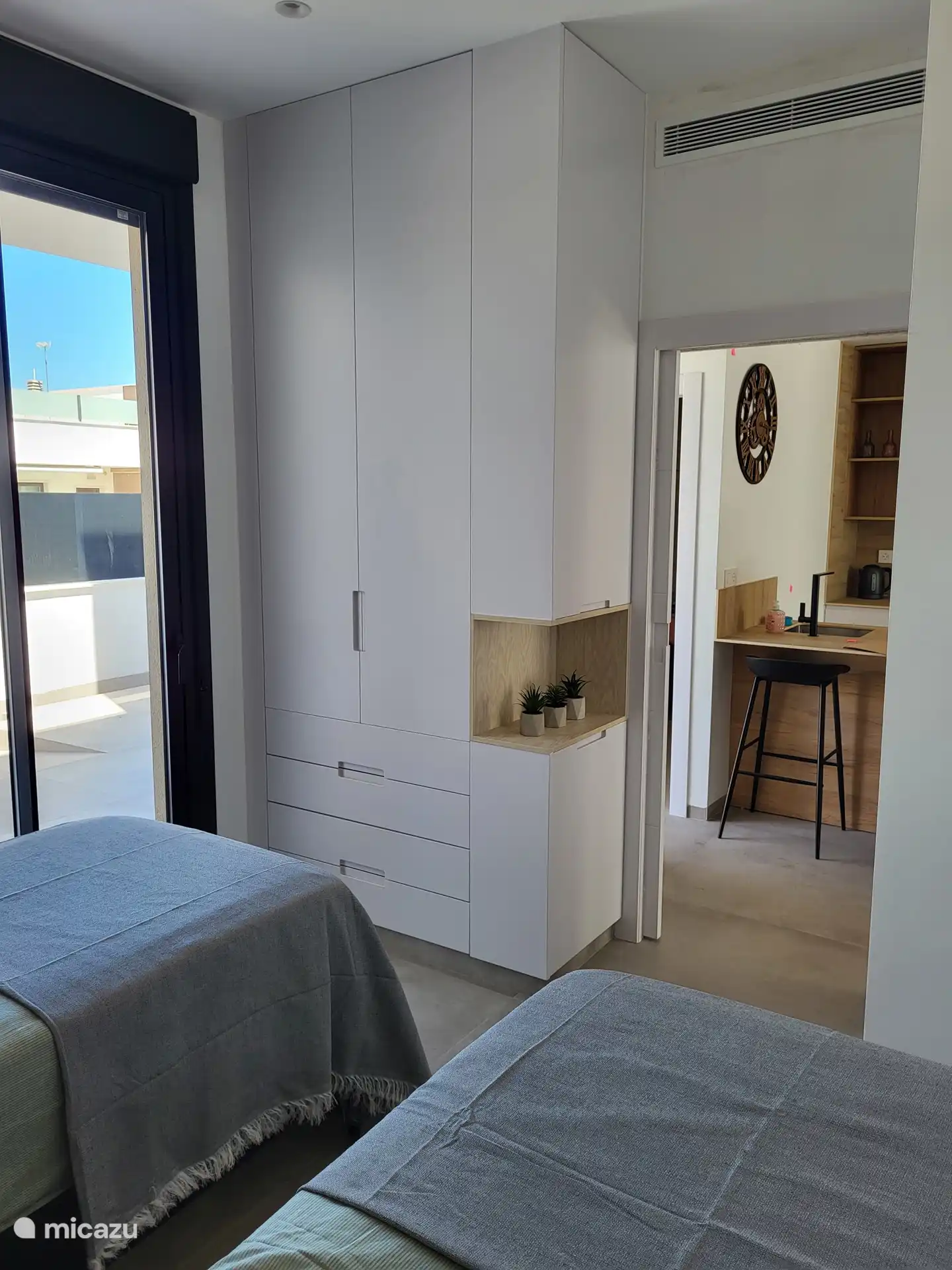 2nd bedroom room has 2 single beds that can be pushed together. As in the master room, this room also has a large wardrobe and sliding doors to the terrace at the front of the apartment.