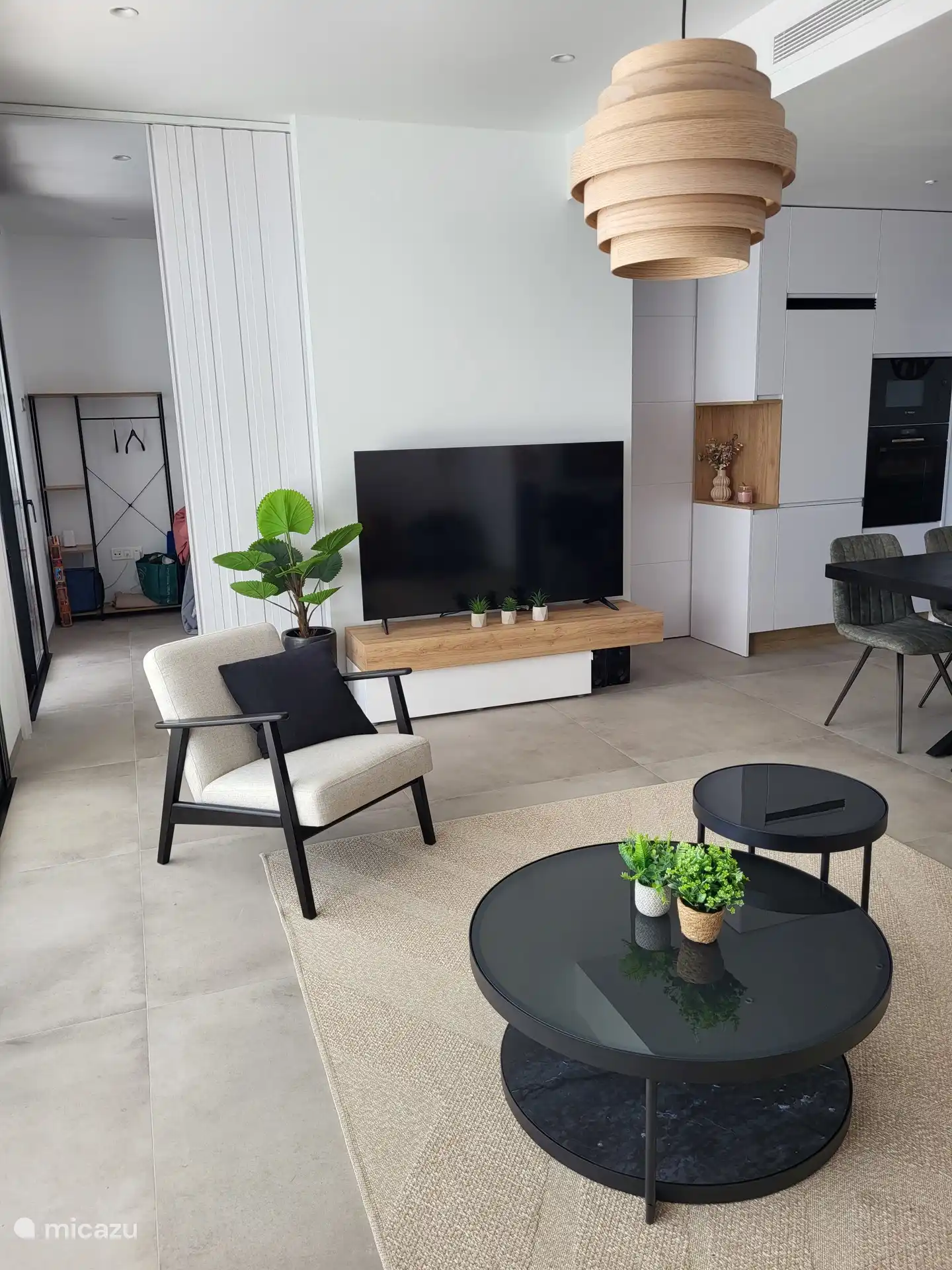 The living room has an open kitchen with every luxury such as an oven, microwave, induction hob and dishwasher. The TV has a built-in Chromecast that allows you to stream your favorite shows.