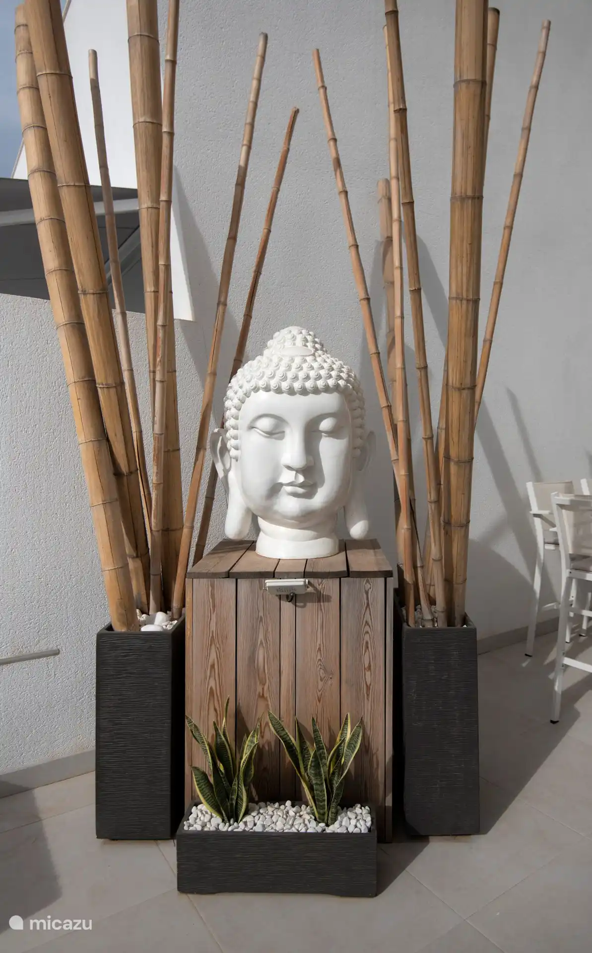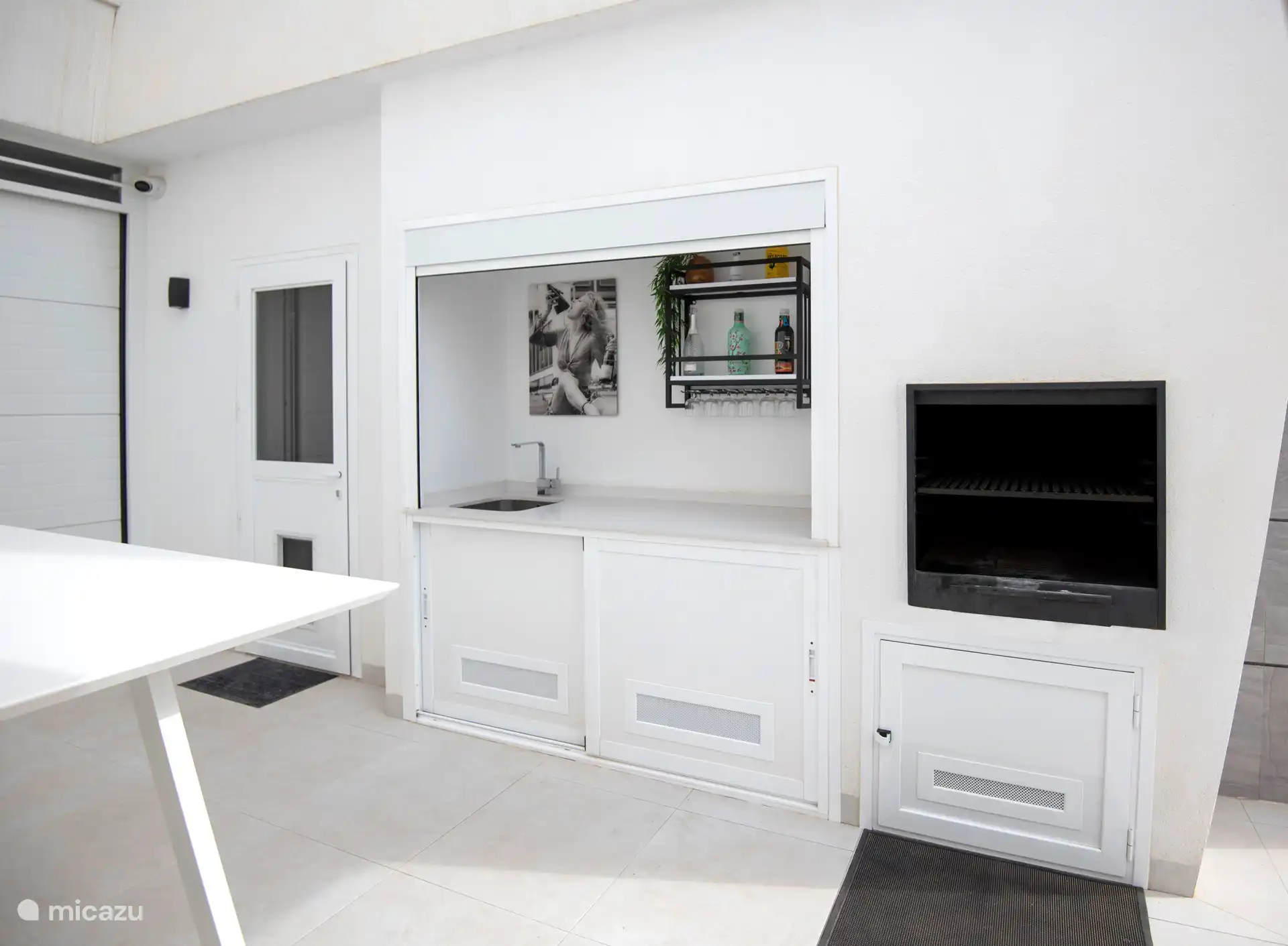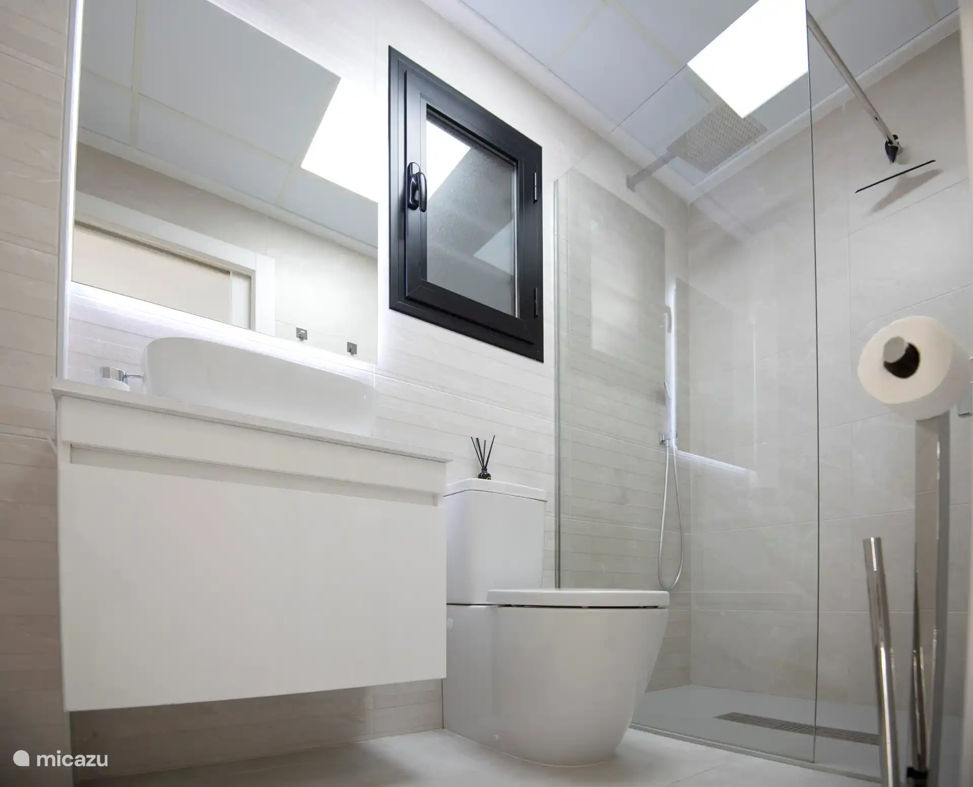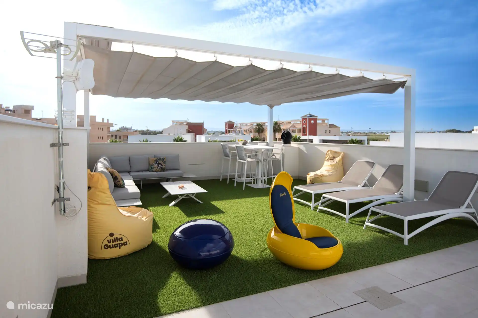 Then we have a lovely large roof terrace with sunbeds, lounge set, high bar, outdoor shower and sun awning (pergola) for when it gets too hot and you prefer some shade.
