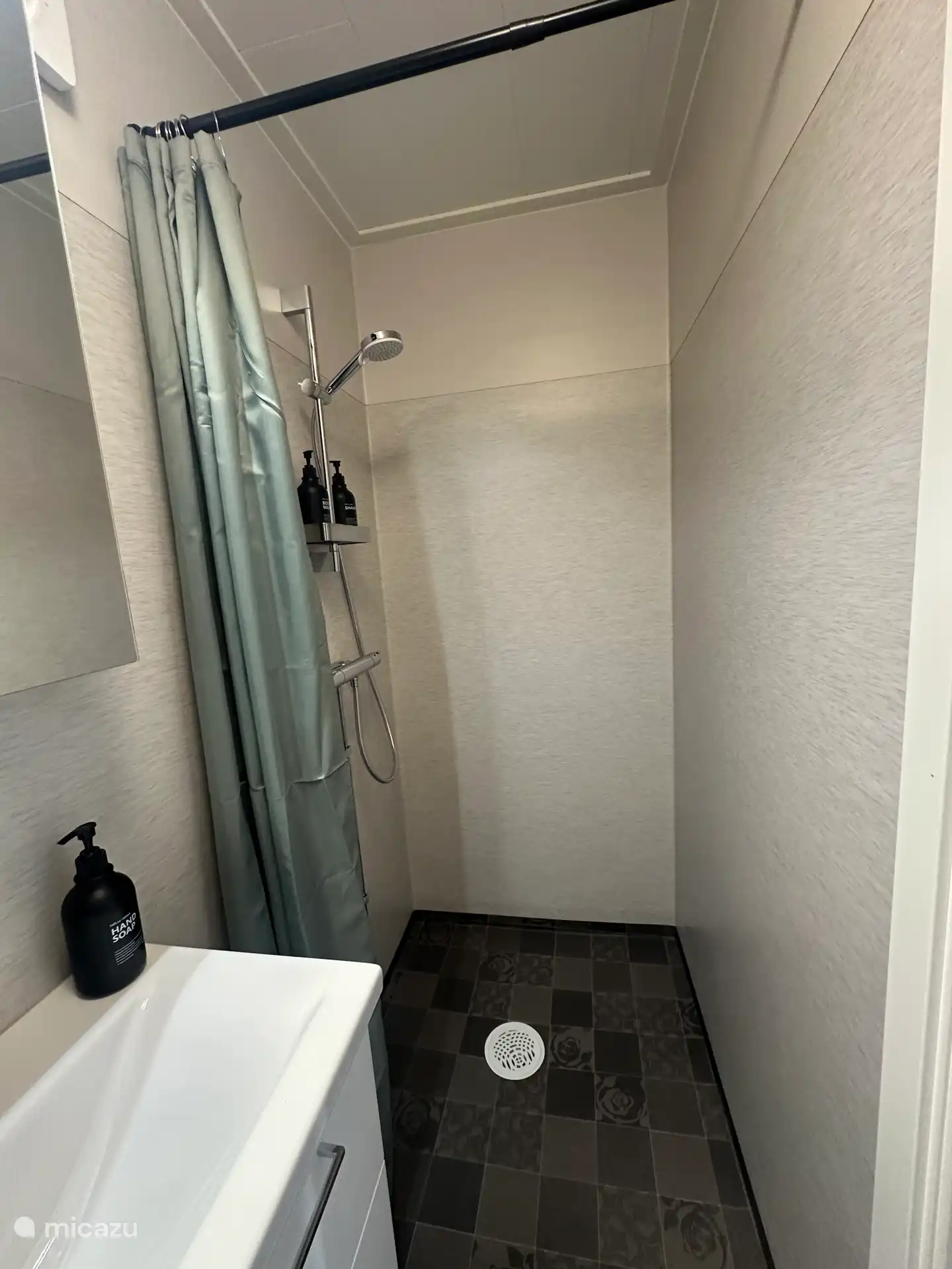 The bathroom has a shower, vanity unit and toilet. Shampoo and shower soap is provided. Bath towels are also provided