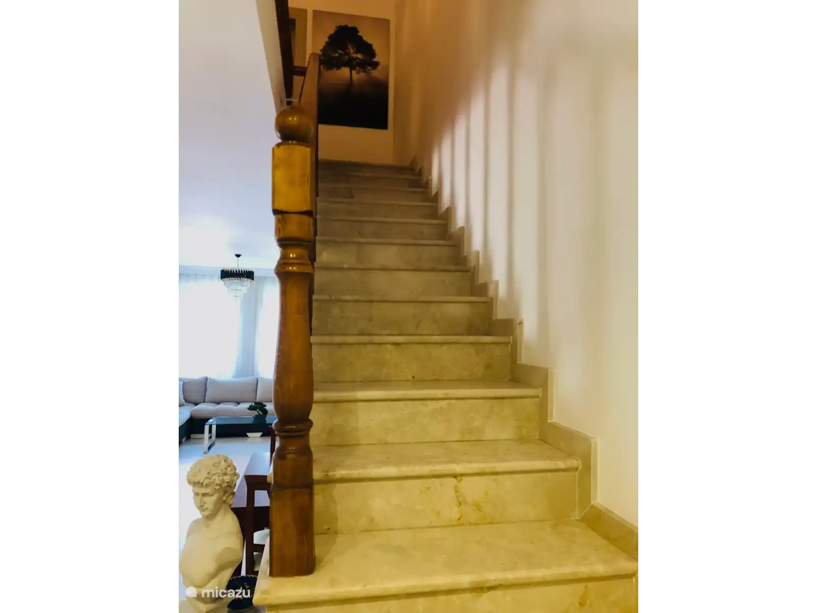 The entire inside of the villa is finished with marble. The living room is spacious with an (extendable) dining table, a dresser and a large, comfortable corner sofa. TV, internet in the park and a sound-bar are available. The villa consists of three floors with two terraces. On the ground floor is the first terrace overlooking the street and the cultural park. The second, large terrace is located on the third floor with a view of the cultural park and the mountains in the interior. There is also a barbecue there. On the ground floor is a small bathroom with shower, bathroom furniture and toilet, on the second floor is a large bathroom with large shower, bathroom furniture and toilet. There is also a washing machine and dryer. The kitchen is excellently facilitated, with microwave, large oven, dishwasher, hob with one electric and three gas burners, kettle, Nespresso machine, milk frother and refrigerator with a separate freezer. On the second floor there are two bedrooms with spacious closets and bedside tables; a master bedroom and a twin bedroom. On the third floor is a sofa bed for two people plus storage cupboard.